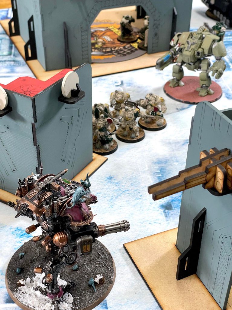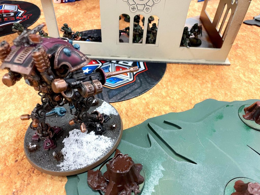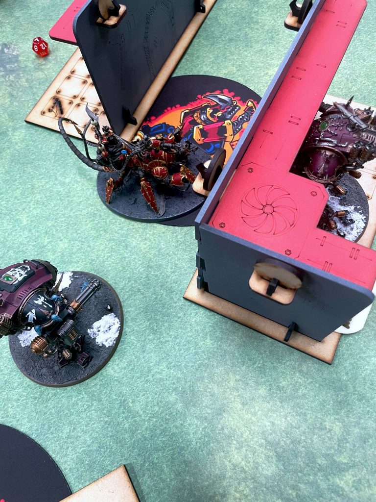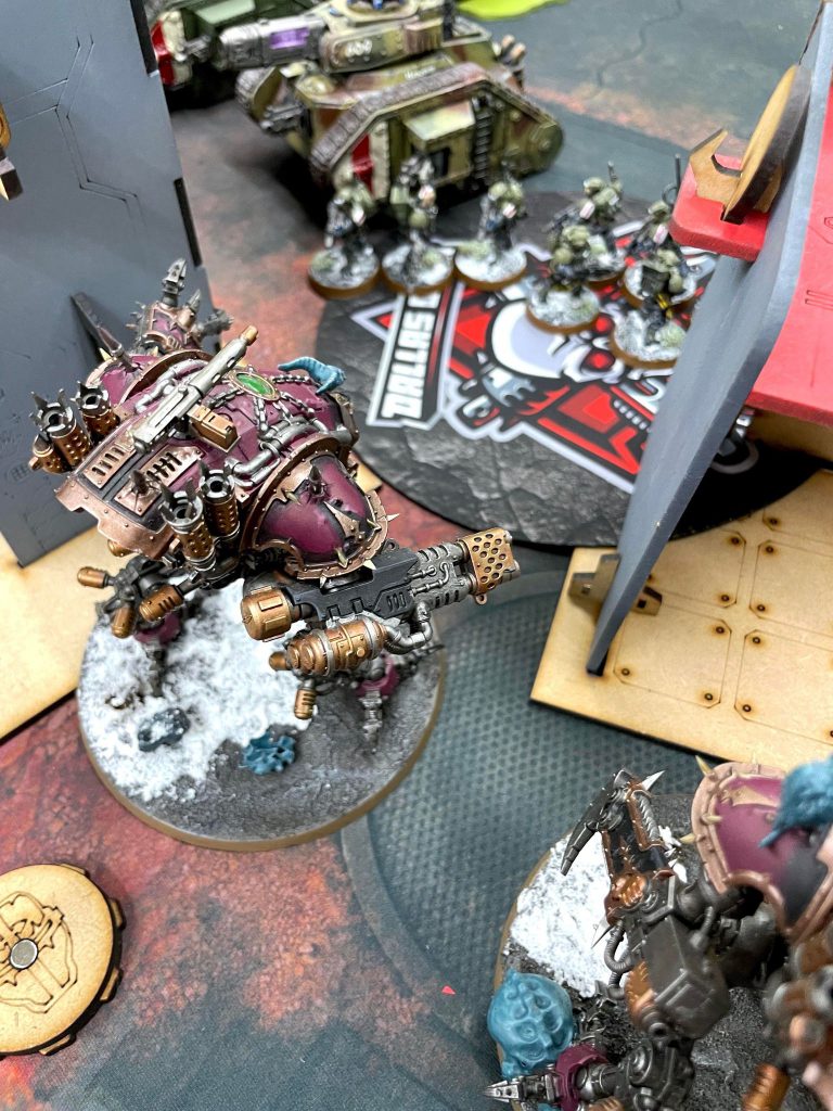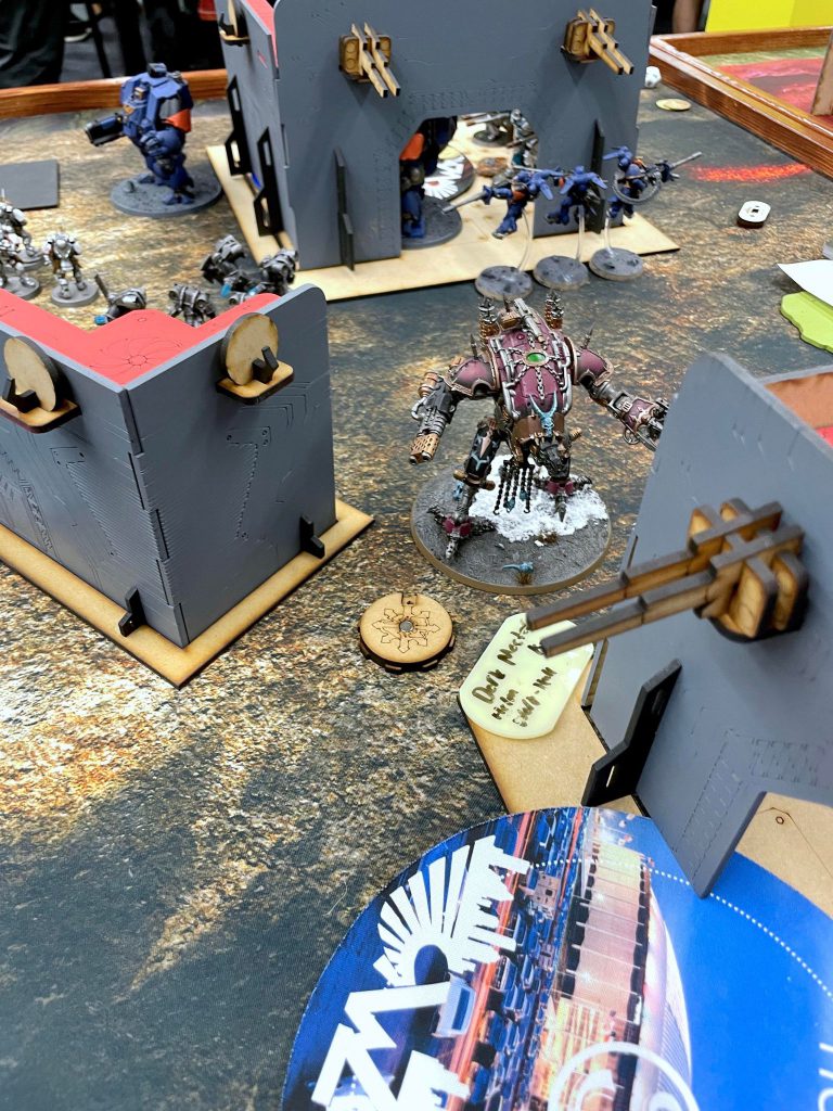 While the matchup is very, very unfavorable for Chaos Knights, Koen is a newer player to the game and isn’t quite able to take advantage of it. Additionally, this table is based on UKTC terrain, so theres plenty of LoS blocking to be had for me. He has a Stormsurge, which will he a problem, but he’s nervous I’ll shoot it to death and puts it in Strategic reserves.