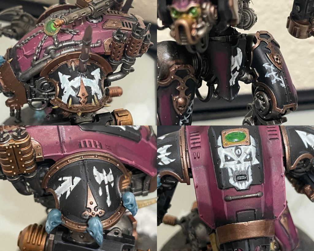 For each design, I would use Celestra Grey to dot out a rough outline of the design, then connect the dots between them and fill in with a few thin coats. I would then apply a few highlights of Army Painter Spaceship Interior, followed by highlights of White Scar. I shaded some areas of the design with Apothecary White and Soulblight Grey to add depth to the designs. Last, add a little weathering from Black Legion and the design would be done. Here’s some pictures of a few of my favorites.