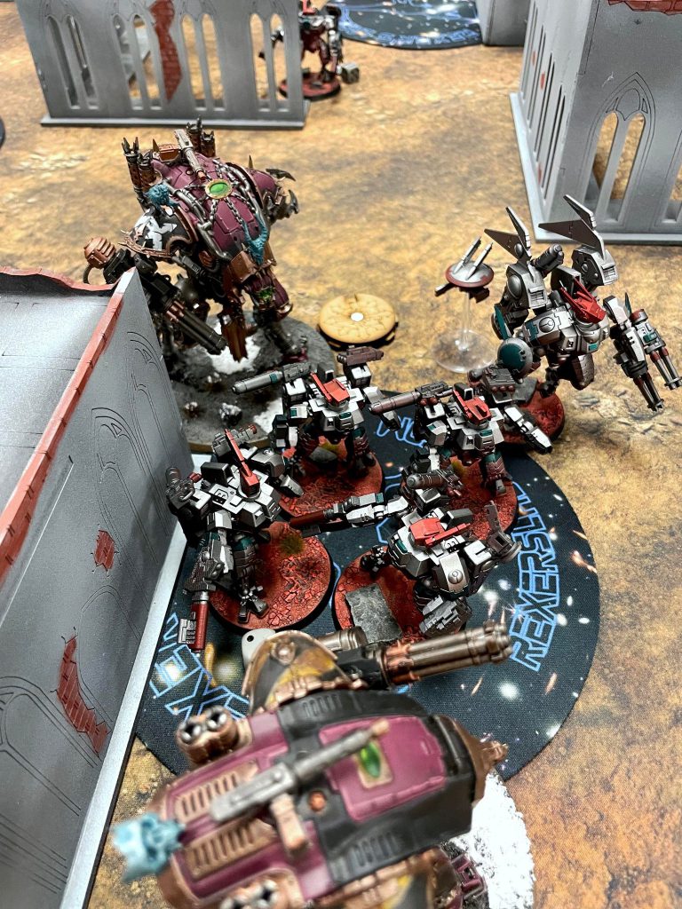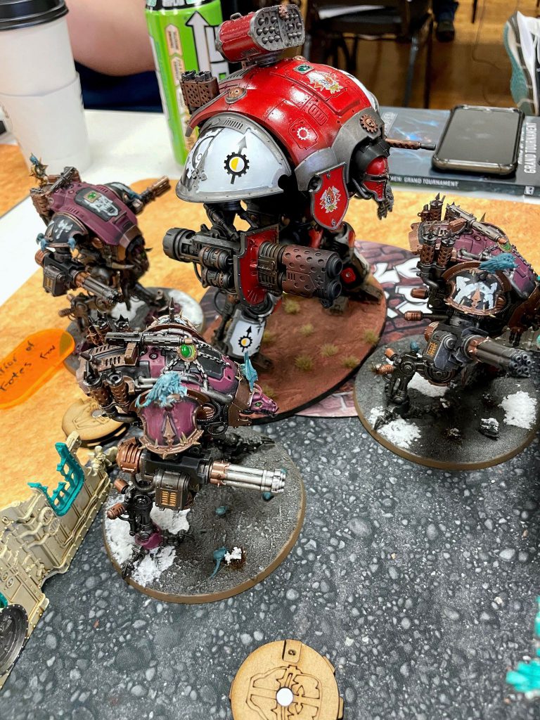 I push forward with my War Dogs and try to put melee pressure on his stuff, as well as take advantage of his lack of Obsec. For a while, it doesn’t look food for me. T’au are very good at killing War Dogs and the terrain makes it difficult for me to maneuver. Once I’m able to apply -1 to hit when shooting me outside 12” from the dread table though, the onslaught of T’au shooting relents long enough for me to get stuck in and from there start getting some big point turns. Despite the third terrible faction matchup in a row, I come away with my first win of the event.