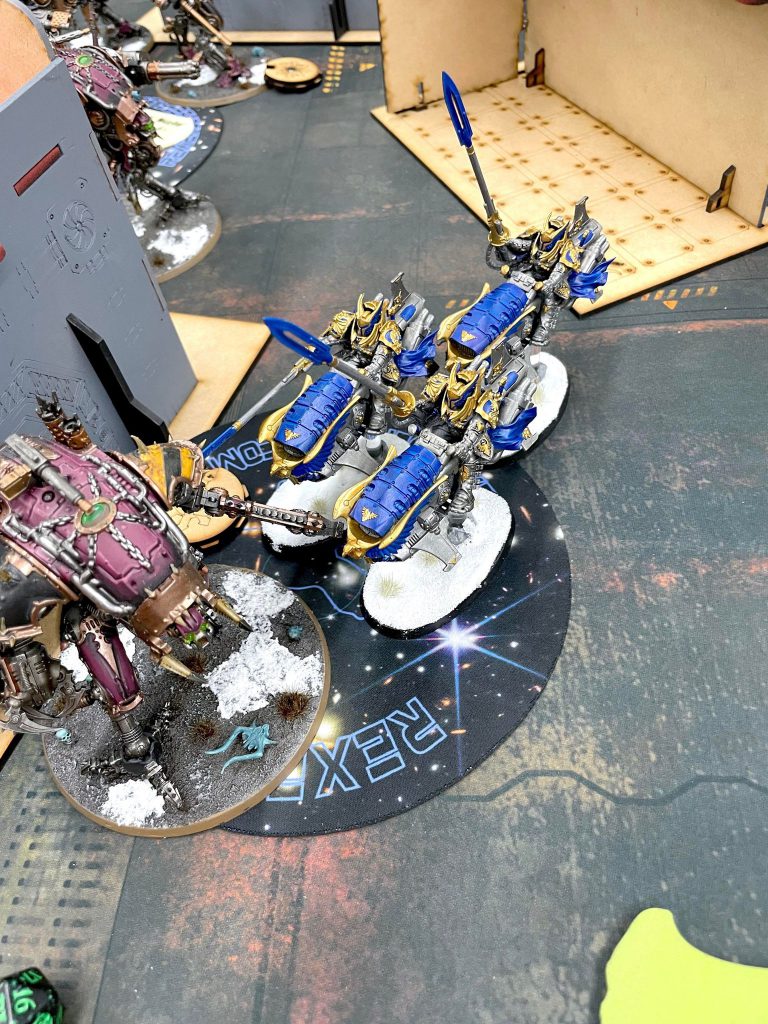 On this final mission, the terrain is adjusted to make some longer sight lines for shooting, which is very exciting news for my executioners. His list has two bike squads and the bike captain, and these are my primary targets at the start of the game. Weirdly, the bikes are more fragile than his infantry since he cant use Arcane Genetic Alchemy or The Emperor’s Auspice on them, so I have a much better chance of dealing with them quickly than footslogging Custodians. If I can take out these mobile elements of his list first, my stuff is fast enough that I can keep good board control the whole game and take home a 4-2 record. I try to keep a level head, but I’m hungry for this last win.