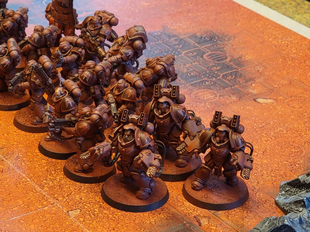 The Chosen, informing the 108th Vallhallan Motor Rifles to "Ante Up"The Chosen just start picking up unit after unit with their combi meltas and accursed weapons over the next few turns. It was like watching a John Wick movie, but it was ten Keanu Reeves and they were all in Chaos-warped power armor. By the end of the mission, they claim seven unit kills in this game. Eddies 1000 point list has ten units. Savage stuff.