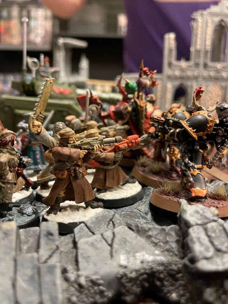 We pick up the narrative in this article following that successful defense. While my crusade team, the Cabal of the Soulbound, was successful in repelling the Space Marines, the other Chaos team had less success. Makarios’s Shock Troops tried to launch an attack on the last holdout of Imperial defenders, the hive city of Kephistrone. It’s beleaguered defenders rallied to it’s defense, and pushed out the Chaos threat. Now invigorated with their victory, the Defenders of Kephistrone have pushed out into the nearby suburban outskirts of Kephistrone called Spall’s Hill to liberate or purge the workers of the Soulbinder’s Daemon Forges.