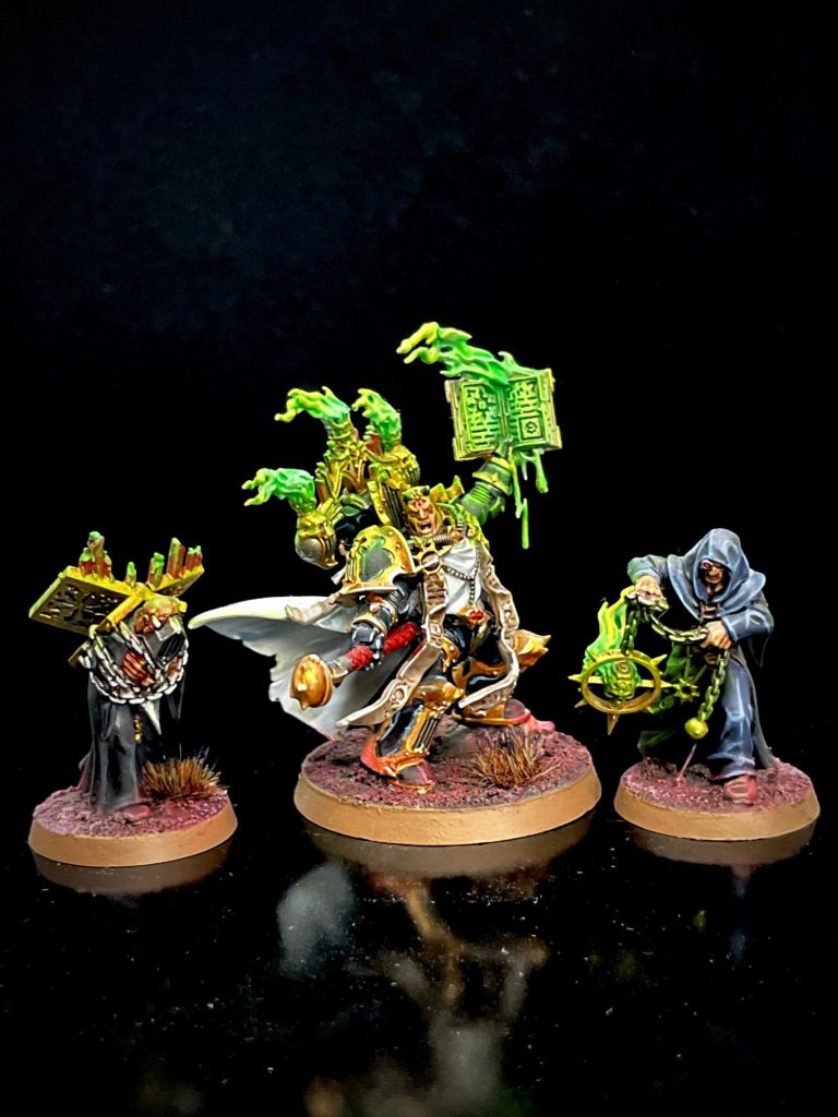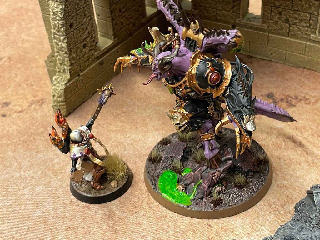 So, if the prayer goes off, Malioch makes 13 AP-3 Str 7 attacks that do mortals on 6’s to wound, rerolling all hits and wounds on the charge. Spicy.