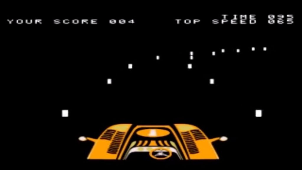 Although putting a static overlay on the screen had fallen out of favor by 1976, Night Driver wears the effect much better than its predecessors, using an overlay of the nose of your car as the screen displays the road ahead and moves as you turn the wheel. This gives the game a compelling “pseudo-3d” feel and more realism than other games of the era.