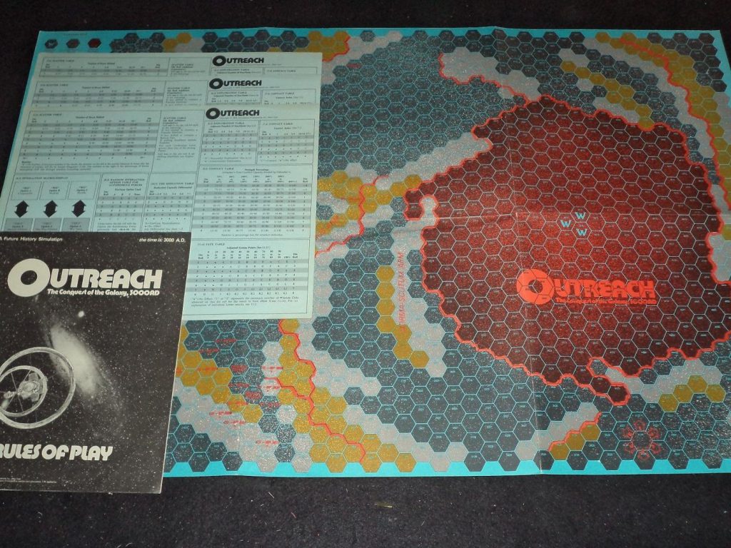 Designed by Irad B. Hardy and published by SPI in 1976, Outreach is a sci-fi board game which focuses on galactic conquest and empire building. Players take the role of factions vying for control of the galaxy and collect resources, build structures, and expand their empires in the pursuit of that goal. The game comes with a 23” x 35” map depicting a portion of its galaxy, where each hex represents an area of space 1200 light years across. When the game starts, only a small portion of the galaxy has been explored, but as players build their fleets and push outward, that changes. One of Outreach’s most evocative aspects is that it measures time in centuries, and turns represent massive spans of time during which the travel and advancement required are possible. The game is a bit of a logistics nightmare and takes forever to play, but has tons of depth.