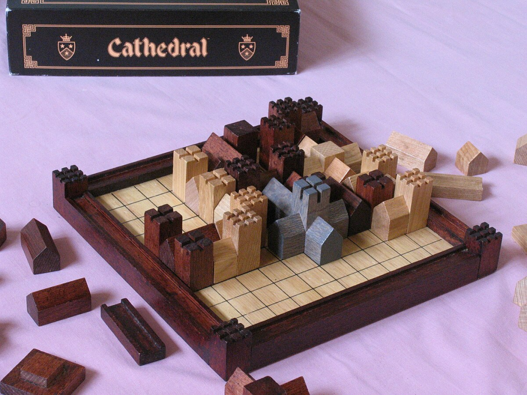This two-player strategy game was designed by Robert Moore and published in 1979. The game starts with one player placing the game’s cathedral on a 10x10 gridded board, after which players alternate placing buildings of their color, attempting to close off areas and claim territory and use as many of their pieces as possible. Claiming areas removes opposing pieces trapped within them, sending them back to an opponent’s hand. At the end of the round, players score points for each building they still hold, and the goal is to have the lowest score possible. Cathedral is a fun, strategically-challenging game with an evocative design. It’s absolutely an underappreciated gem, but one that’s been receiving a bit more attention with recent publications.