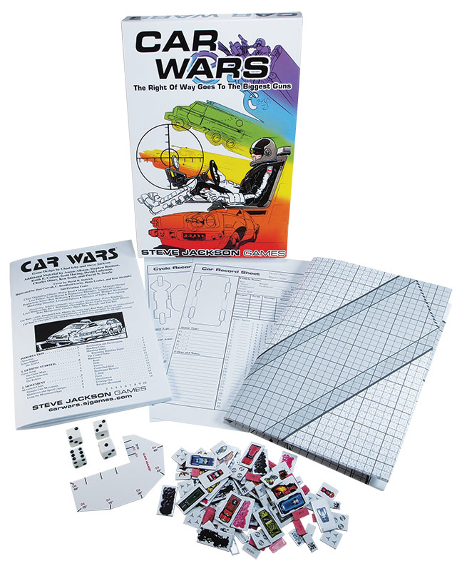 Released in 1980 by Steve Jackson Games, Car Wars is a vehicular combat game inspired by Mad Max and Death Race 2000. Players take control of one or more cars and attempt to wreck each other’s rides. The game comes with cardstock print-outs of vehicles on a set of die-cut cardboard sheets, but the real way to play is to use a bunch of Matchbox or Hot Wheels cars (this would become the official scale of play in later editions). Dice are used to determine combat outcomes and players can customize their drivers and cars, gaining skills and money. The game has been republished many times since its original release and is currently on its sixth edition.