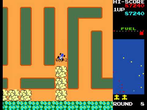 Namco’s Rally-X released to arcades in October 1980 and in many ways it’s a successor to Sega’s 1979 game Head On. Rally-X is a maze game with cars and simple rules: “By dodging red cars and rocks. Clear 10 flags before fuel runs out.” From there players navigate the scrolling maze in a game that incorporated a number of cutting-edge advancements of the time, such as full color graphics, screen scrolling, a persistent soundtrack, a mini-map showing flag locations, changing levels with increased difficulty, and overlapping sprite effects. The game has enough going on to make it stand out from Pac-Man and it’s a legitimately good time.