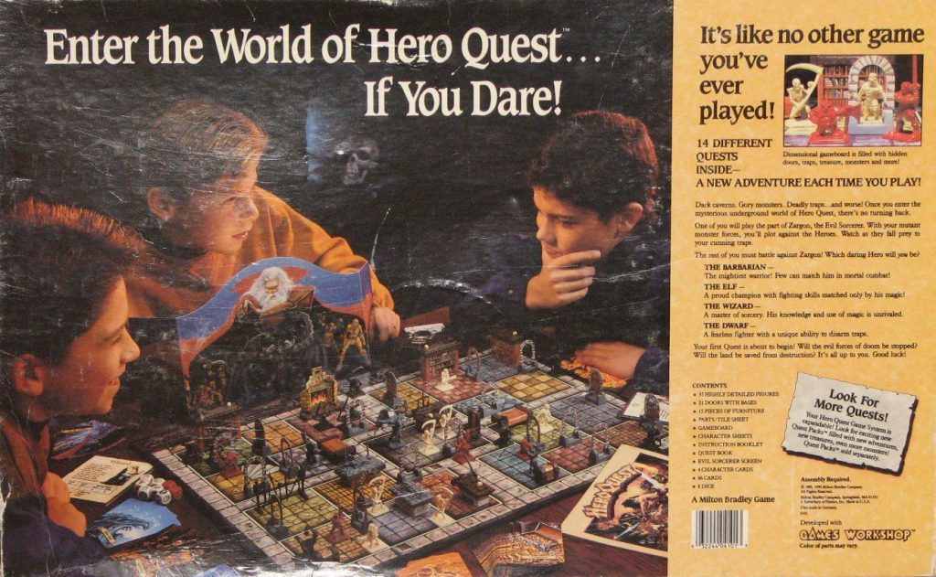 Milton Bradley partnered with Games Workshop in 1989 to produce the first run of HeroQuest, a dungeon crawling board game based around tabletop RPGs in a fantasy setting. In HeroQuest one player takes on the role of Zargon (basically a DM) while the others take on the role of four heroes - Barbarian, Dwarf, Elf, and Wizard - and attempt to delve into a series of dungeons to thwart Zargon’s plans. Featuring plastic miniatures and furniture from Games Workshop, HeroQuest was a great introduction to the role playing genre for younger players who couldn’t yet tackle D&D, and a great introduction to plastic miniatures for a generation of future Warhammer players.