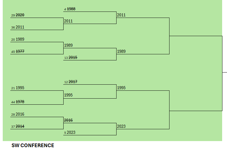 Yesterday we looked at some tough matchups in the Northeast conference. As expected, 1998 rolled past its competition, while 1993 narrowly edged out 2019 to advance to the next round.