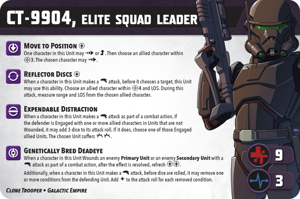 General Grievous, Asajj Ventress, and a ton of Battle Droids. Painting and photo by Jefferson Powers.Over on the Imperial side, General Veers is focused primarily on backing up his Snowtroopers, so it’s a pity that none of CT-9904’s Elite Squad Troopers have the Stormtrooper tag. The Snowtrooper Lieutenant is a little more versatile, with two abilities targeting the Galactic Empire tag that ES-04 and the Elite Squad Troopers might be able to make use of. CT-9904 is similar to Ventress in that he’s a bit of a loner who is focused heavily on attacks and wounding enemy units. Thankfully, the recently rebalanced Elite Squad Troopers can lend their Supporting Fire abilities to any Galactic Empire unit.