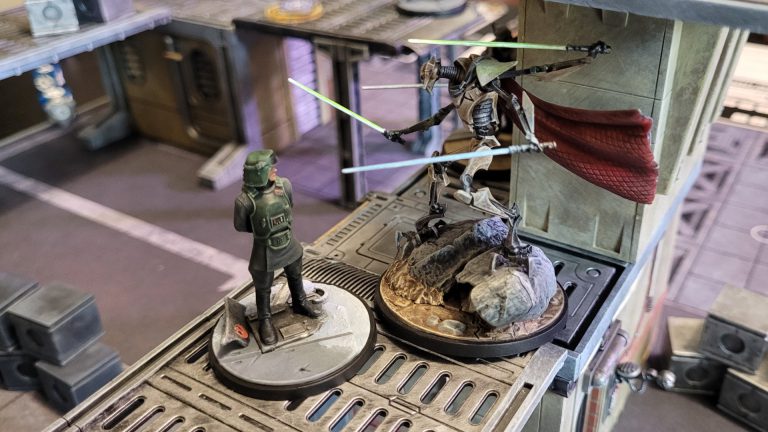Grievous knocks Veers off his perch. Painting and photo by Jefferson Powers.My next draw was my Shatterpoint card. I used it to activate General Grievous, thinking that with the extra advance provided by his Scuttle ability, he might be able to get to the active objective at the center edge of the board, the farthest from both of our starting edges. Grievous first used Onward, his Tactic ability, to move one of the B2s forward, but he wasn’t quite able to make it to the objective. He did get a shot off at one of the Elite Squad Troopers, dealing 4 damage, a shove, and a pinned, and then used Appetite for Destruction to move the same B2 forward a bit more. Unfortunately, the Elite Squad Trooper was no longer in line of sight after Grievous’ shove knocked him off of the maintenance bay, so the B2 couldn’t take advantage of the free attack. I still controlled 2 objectives, but so did my opponent, so neither of us was really making any gains on the struggle tracker.