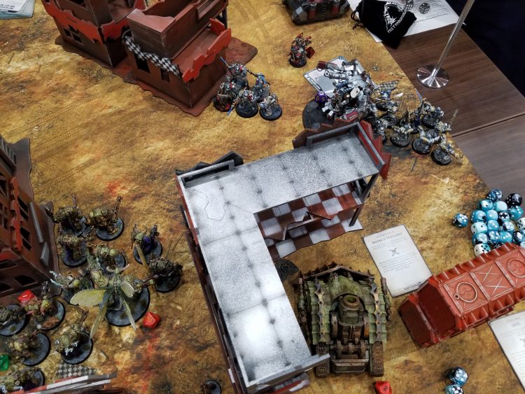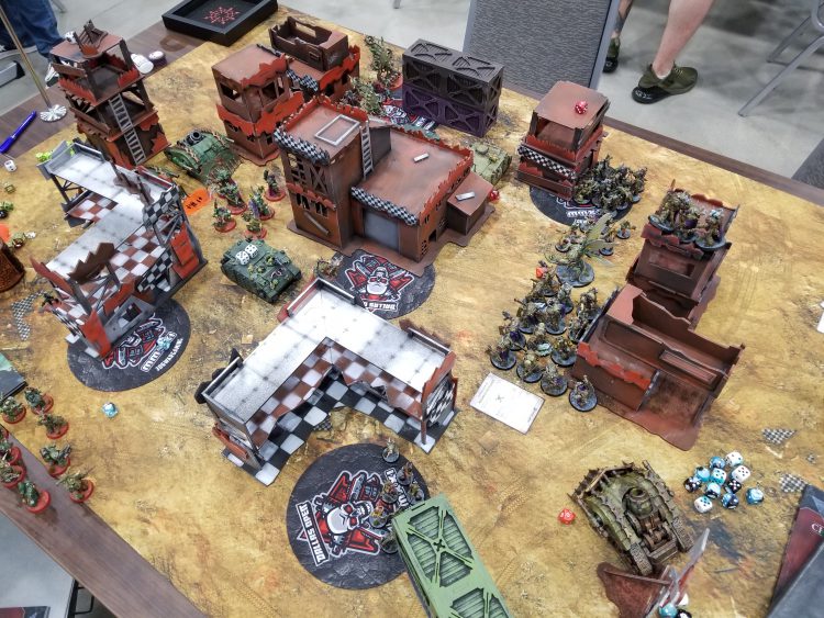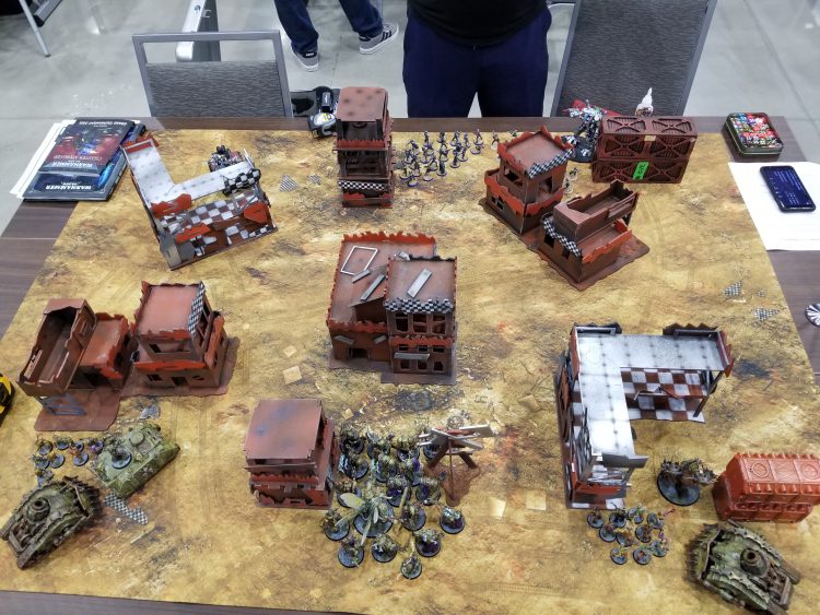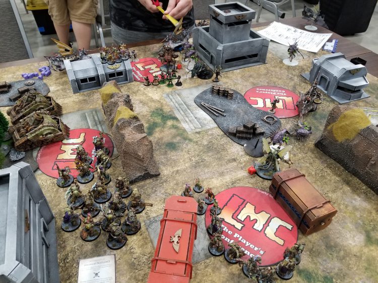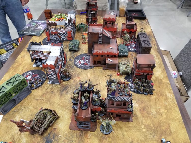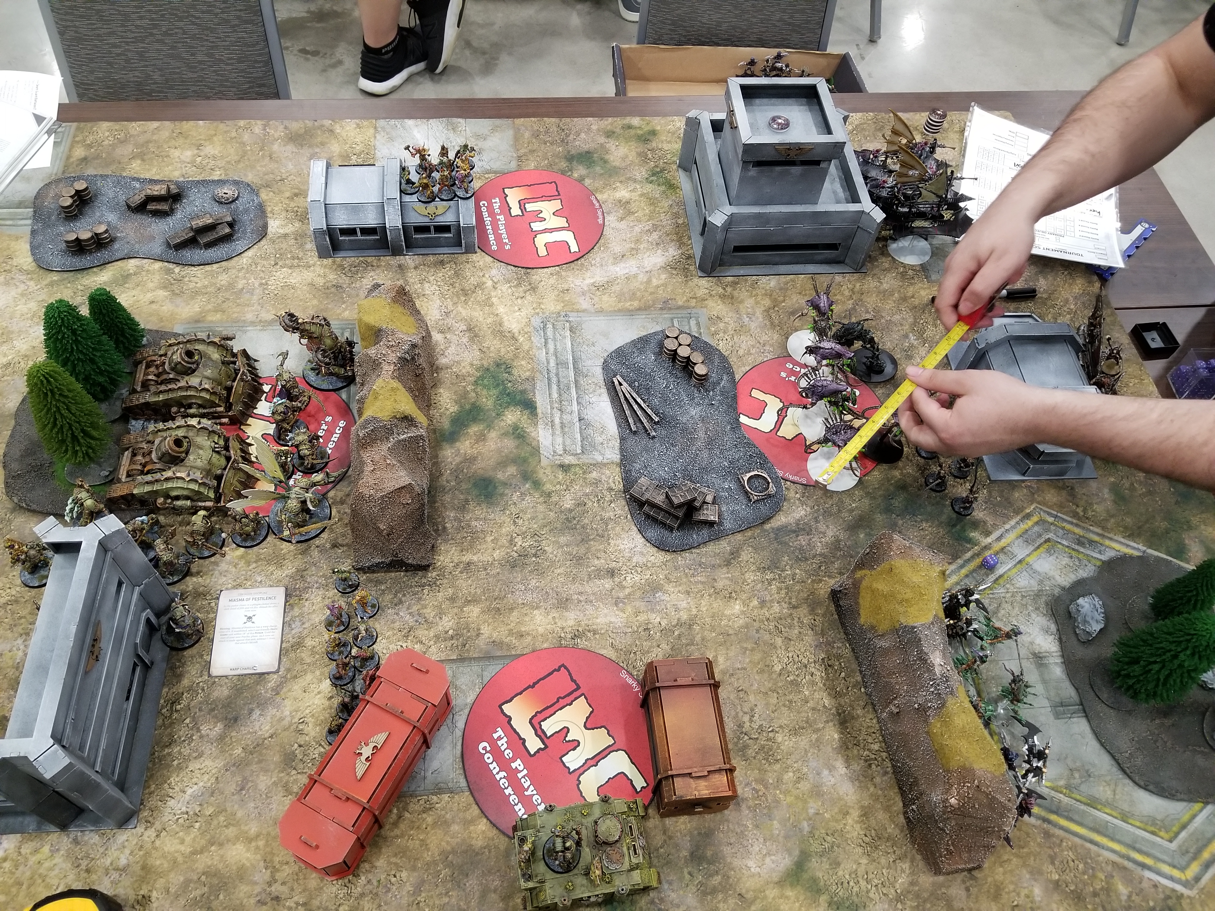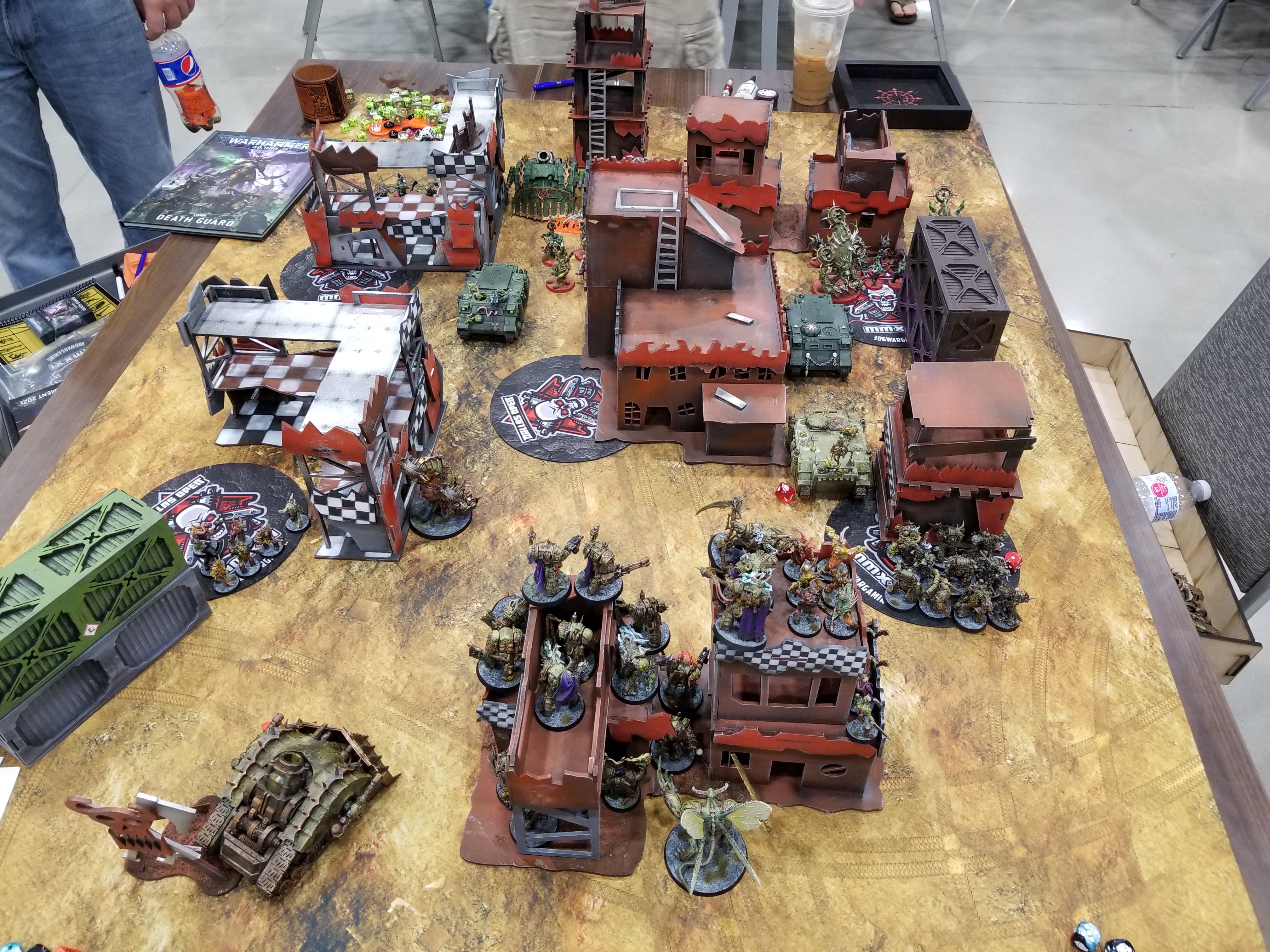 The Terrain setups at the Lone Star Open. Players would split the terrain on each table and place it in their own table halvesThis helped mitigate some potentially disastrous table setups for some armies, though it could cause real problems for others. There are also some weird quirks, like the one ork sign on table 1 there being the only dense terrain on that board. If you got that half of the terrain, you could make a nice little back-toe-in dense cover for your plagueburst crawlers, which is what I did in game 4. I didn't love the terrain at the event but overall it was fine. I've played on worse and there was enough of it to make the tables feel solid.