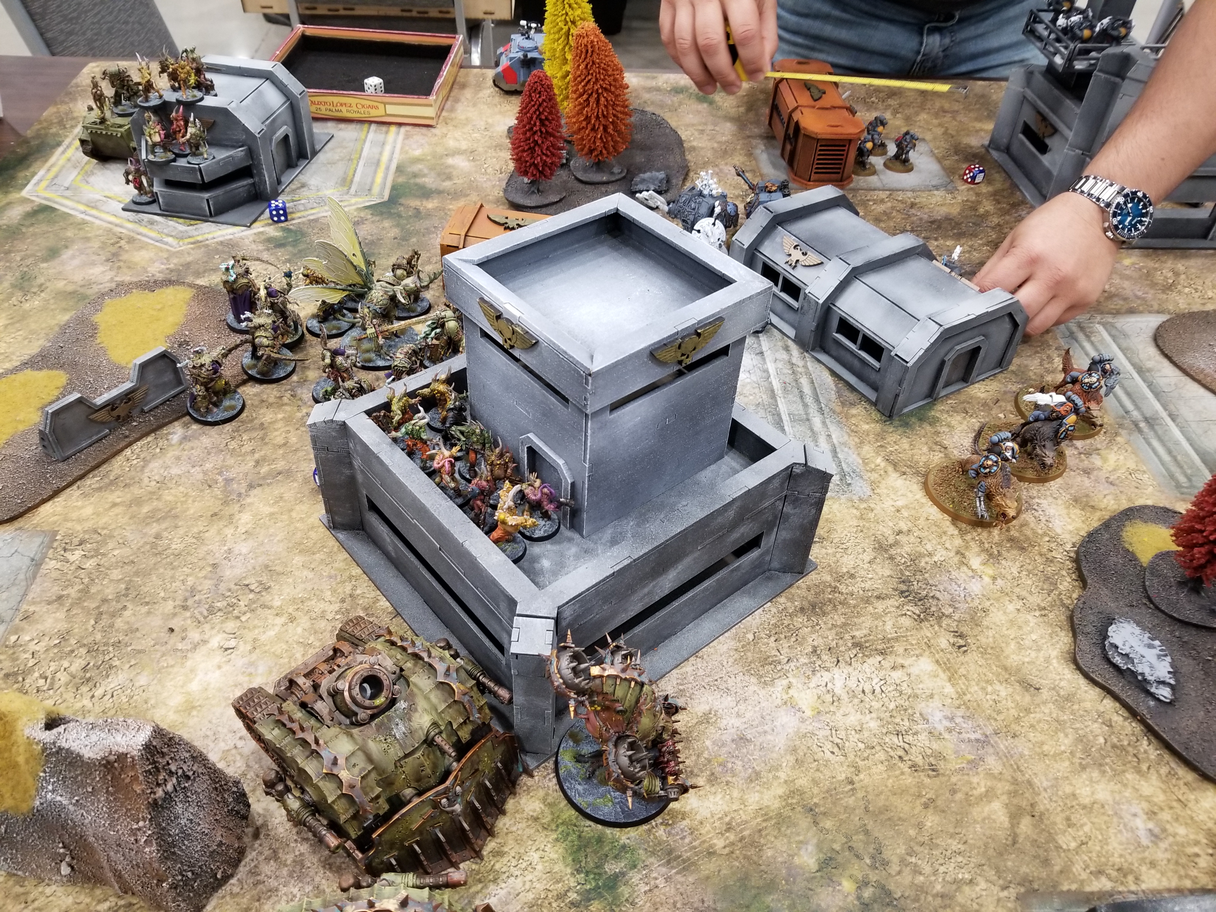 A whole lotta mortal wounds when these assholes dropped inI was able to make a good start of it early by pressing up the table on the left side, wiping out a squad of paladins and holding one of the objectives in his deployment zone with the plague marines essentially all game. That's good because it means I score a 15-point 2nd turn and am able to keep them over there out of sight all game, taking enough shots at his Razorback to kill it. On the other side of the table however, things don't go so well - the Grandmaster Dreadknight spent all game getting great saves, and managed to survive three turns of being knocked down to only 1 wound (and then healing back 2D3 with the techmarine). Rick's attempt to drop a Callidus and his Terminators deep in my lines doesn't go as well as he'd like, and I'm able to wipe those out without dealing with their charges thanks to the Deathshrouds. His big teleporting blob gives my Blightlords fits however, and he's able to kill the Daemon Prince to score 4 points on Assassination. Ultimately however Rick's slow play (and admittedly I could have gone a bit faster) catches up to us and we're only able to finish three turns, though I intentionally refrain from rushing to start my fourth before time expires - that shit's just bad form in my opinion. At the end I have 3 points for Assassination, 6 for spread the sickness, plus another 10 for To the Last and 25 on Primary to Rick's 10, plus 7 for Assassination and 15 for To the Last - he ended up with nothing in my deployment zone. Another round or two and I think Rick might have pulled this one out, though I'd have likely been able to keep scoring 10 and max out primary, plus put another spread the sickness marker down with the plague marines and kill his dreadknight, so he'd have to beat 76-81 points, depending on whether he could kill my Blightlords.