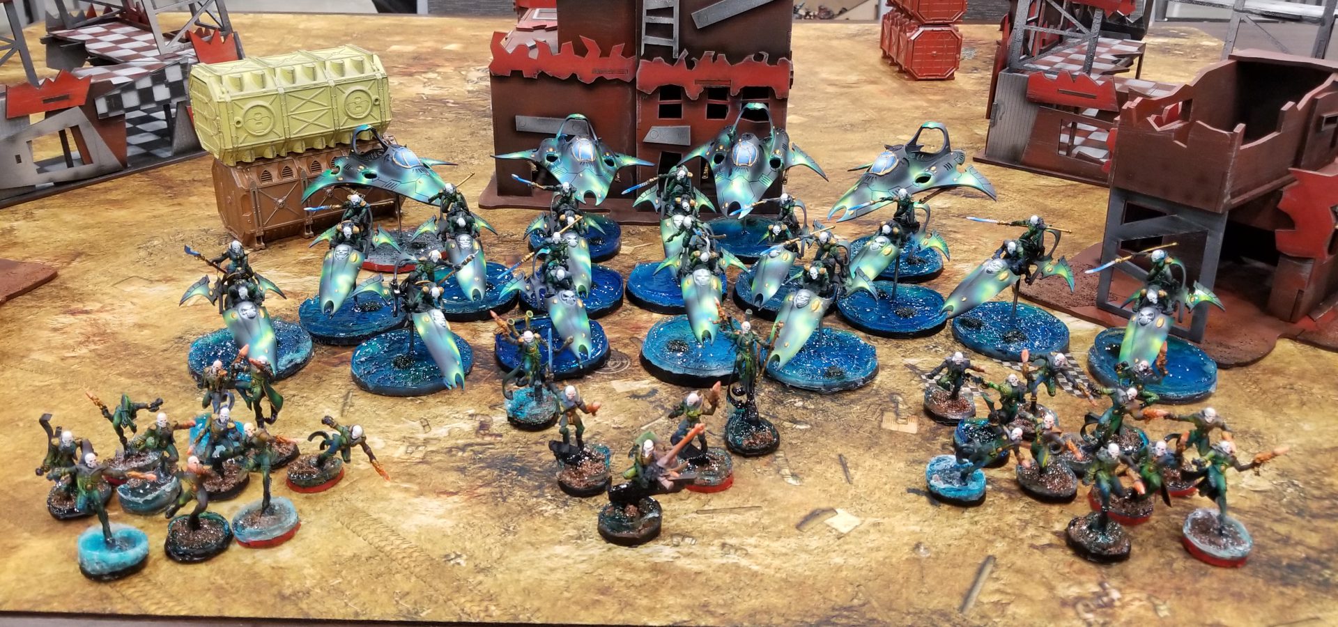 Justin's pretty Starweavers, after being removed from the table by Don's Myphitic Blight-Haulers during the Sunday RTT.Justin was a great opponent and helped me look for my phone. He also had a very pretty Harlequins army that he'd come down to the wire painting, only finishing right before the event. The water bases on them came out great and I was glad Justin was able to make it to 3-3 by the end of the event.