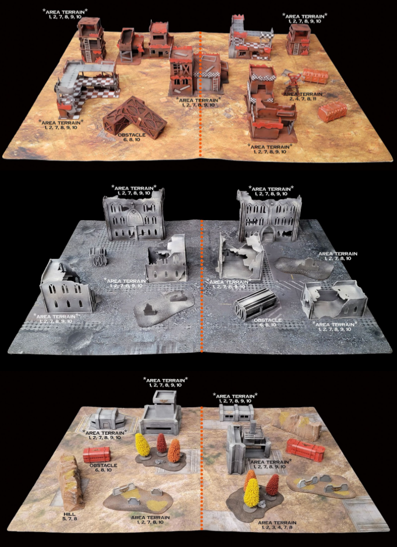 - Almost all of the terrain had the Obscuring keyword, and was considered to be infinitely tall, even if it had nothing on it. This led to several boards where empty flat area bases were actually LOS blockers.