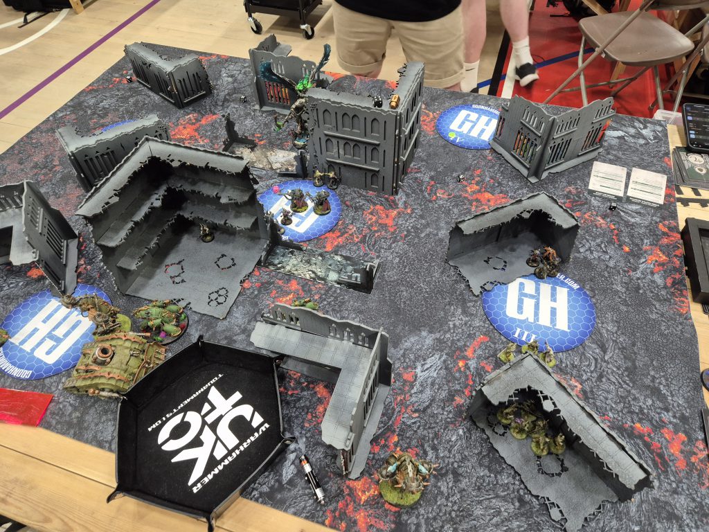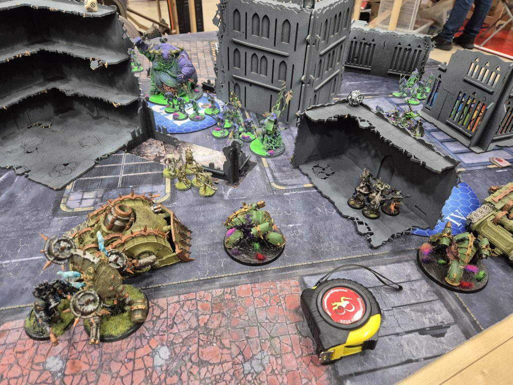 Plaguebearers absolutely everywhere.This was a very pleasant game, but not a very exciting one. Danny's plan is basically to set up and not cross the halfway line while forcing Battle-shocks so that you struggle to hold primary. His units can kill stuff and he was smart in using them to push to stop me having the run of the board, but it's a very defensive plan. I was lucky a few times here that I was able to keep him off holding more, and then on turn 3 I was also able to take his home objective by dropping the Deathshroud into a tight gap behind the Nurglings he had covering it.