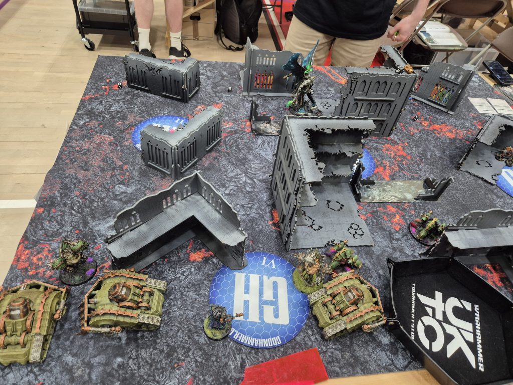 Opposing team: Vanguard Tactics Opposing players and factions:Lee - T'au Empire (Auxiliary Cadre). It says James in BCP, but he was ill and replaced for the event by Lee playing his list. Matthew - Space Wolves (Saga of the Beastslayer) Sam - Death Guard (Mortarion's Hammer) Ben - Orks (War Horde) Luke - Aeldari (Aspect Host)
