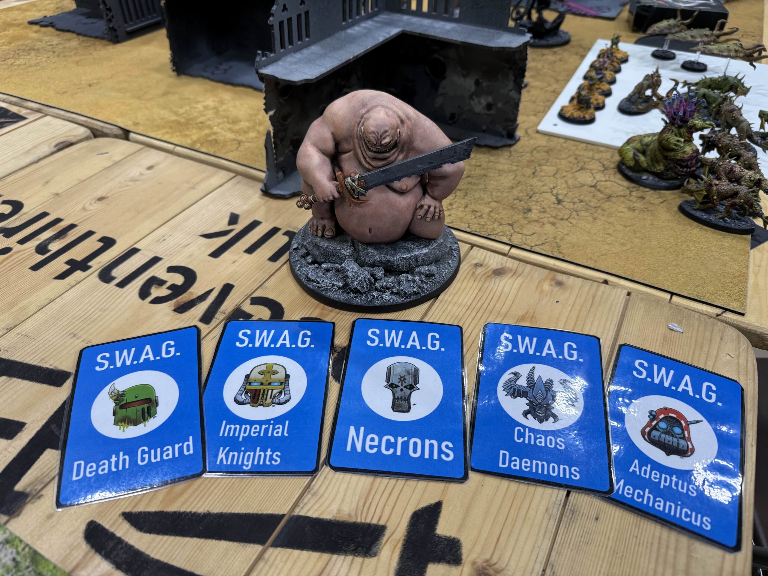 Our horrible mascot, the Great Clean One, poses with our pariings cards.Based on the factions here, the basic goal is for me and Luke to try and win big, while Tom, Ash and Wings are able to take tough games and drag points out of them - ideally they still get good match-ups where they get decent wins, but into rough opponents their beefy, hard to beat lists ought to still get good losses which can be made up for elsewhere. Ash has an additional role as a counter to Knights, helping us with an otherwise tough match-up. The plan is ok, but 3 of us have changed factions for this event with very little practice, so it's harder to evaluate match-ups than it ought to be.