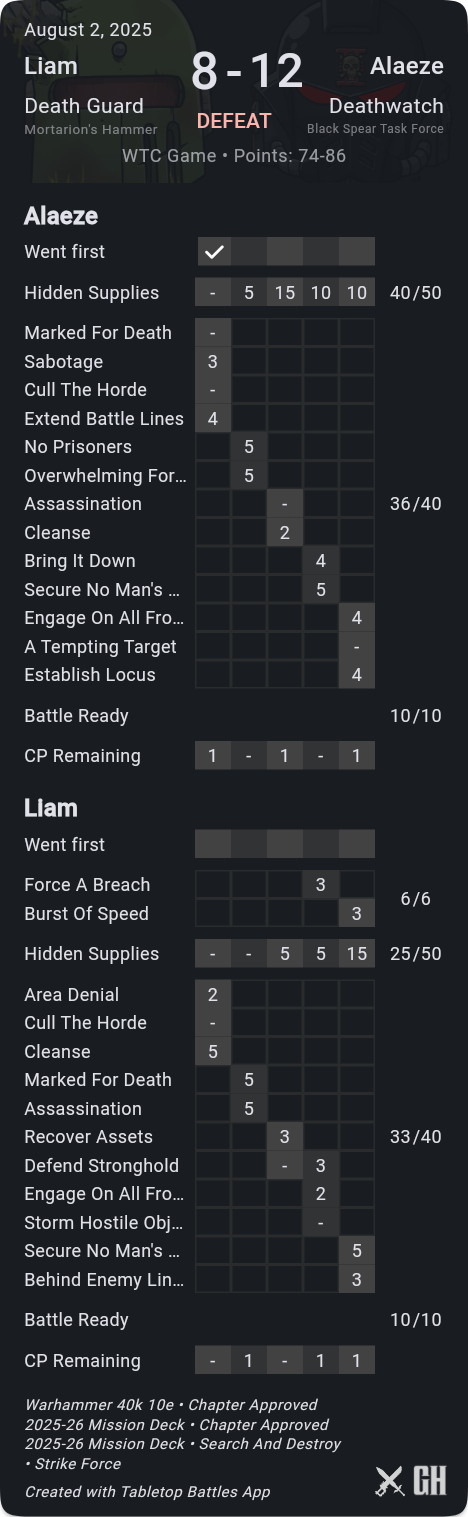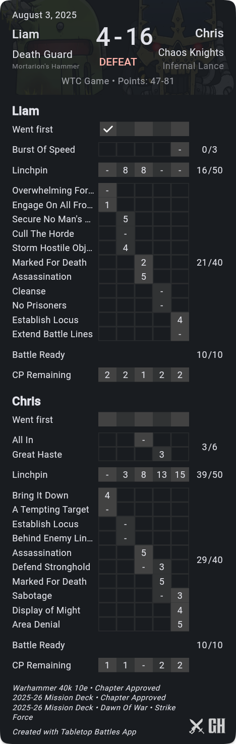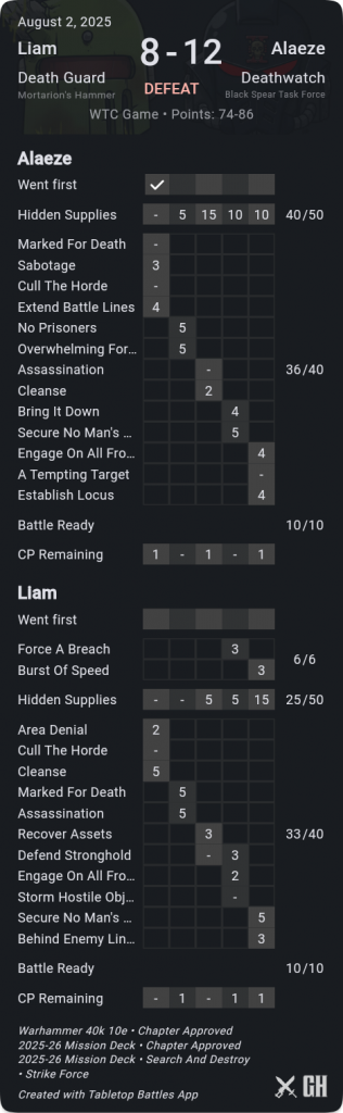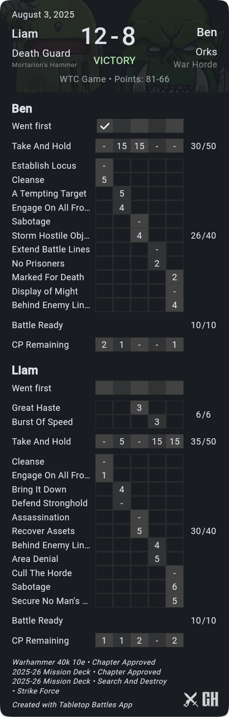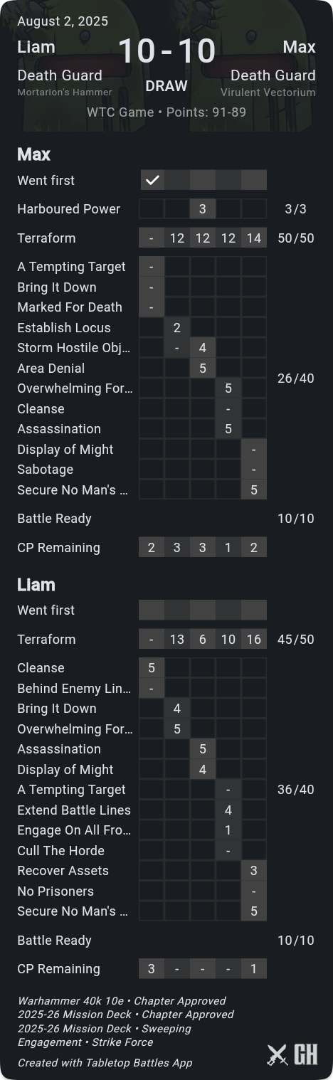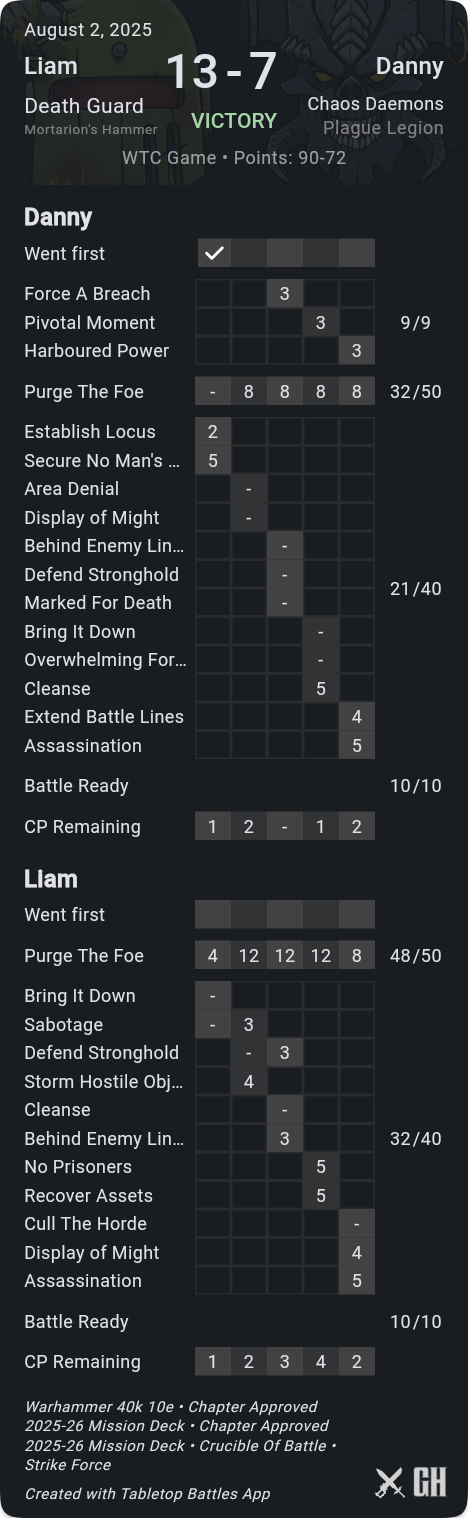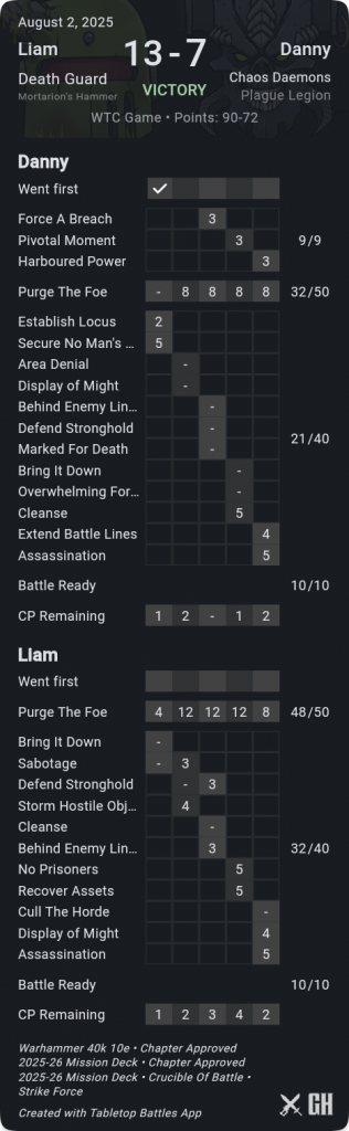 A key difference-maker here was that I was consistently able to pick up kill more, while holding him off hold more, so that his primary scoring was only ok. Meanwhile his secondaries just didn't go well at all - he drew Defend Stronghold when I'd already picked the Nurglings to be afflicted so that I could take them off home with very little he could do about it, and Marked for Death where he was unfortunate to not even kill the Gamma target. On his final turn he stepped Rotigus onto his home to out-OC my Deathshroud and save himself on Extend, but I'd kept his score down well and even with 9pts from Challenger cards he was stuck on 72pts.