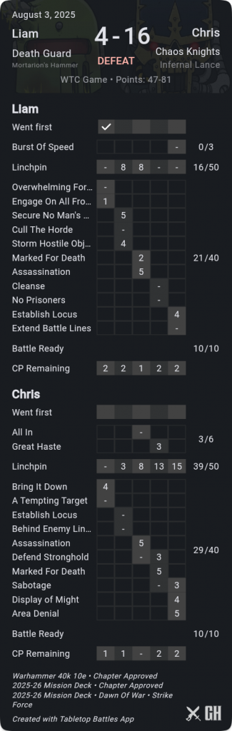 Round 4 deployment.If there's any faction which is more of a problem than Death Guard right now, it's Chaos Knights. Chris' list had fewer bigs than others and felt much more beatable as a result, and in the early going here I was looking pretty good. If you consult the scorecard though, you'll notice I score 43pts by turn 3 and then don't get anything again until turn 5 where a Poxwalker gets a very fortunate Establish Locus in his backfield.