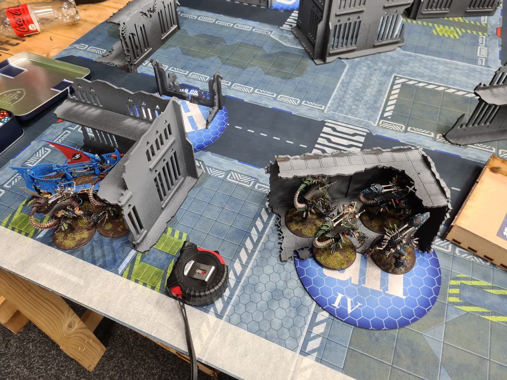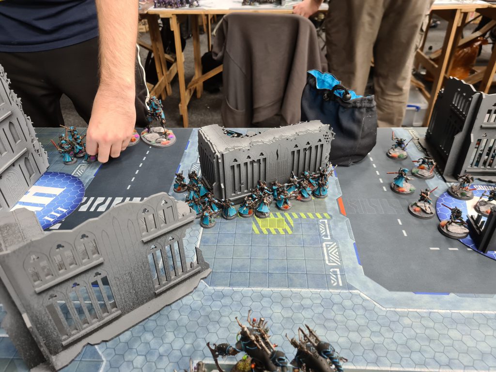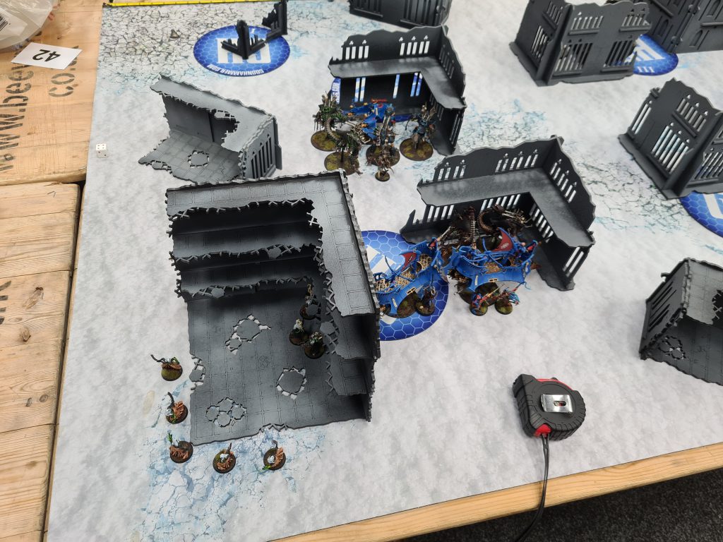 I went first and decided to play like a complete chump. Drazhar and two units of Incubi jumped out of their boats in an attempt to charge the Blightspawn and Daemon Prince, and while two units managed it even through the -2" stratagem I didn't even roll for the third one because they were unlikely to make it, despite there being no reason they shouldn't at least roll the dice? As was predictable I didn't manage to do enough to them, and on turn 1 I lost Draz and 10 Incubi in return.