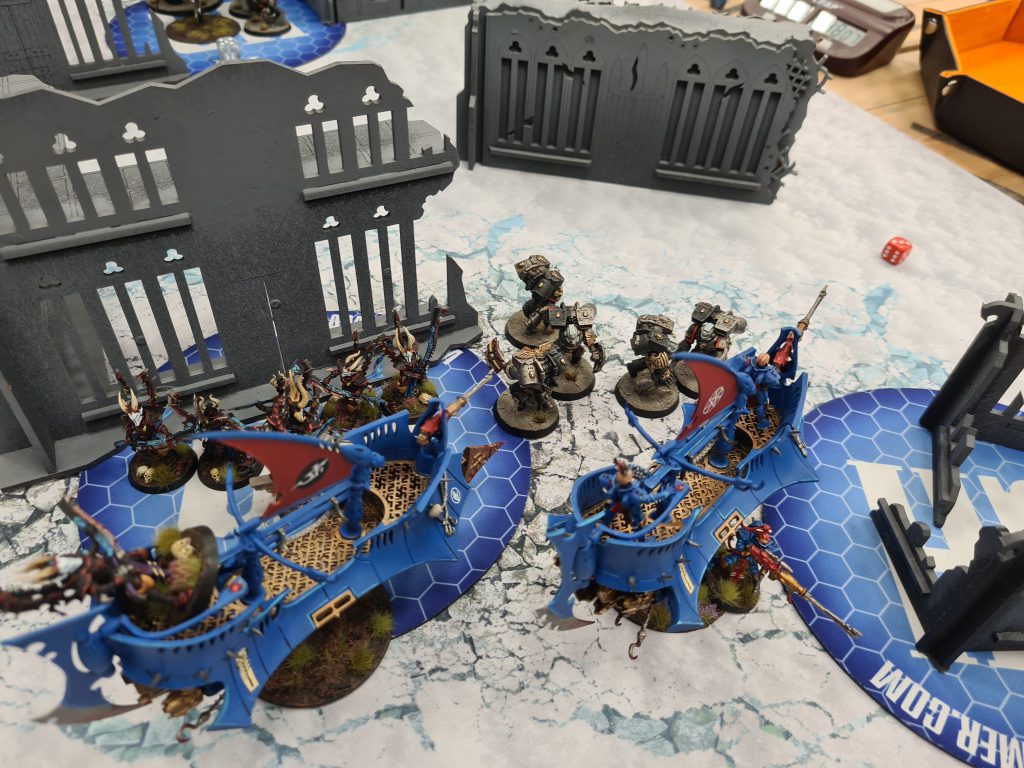 On his other flank he'd also brought out some Skitarii Vanguard to shoot up Talos, successfully killing a squad with them. However, on my 3, I unveiled my not-so-secret weapon - the shock prow on my Raider. The boat charged forwards, and with the classic shock prow Tokyo Drift manoeuvre it managed to make contact with a full 12 Vanguard, and high-rolled to kill 10 of them with mortal wounds. On my left hand side Drazhar and some Incubi killed his unit of 2 Ironstriders, while the third unit of Incubi managed to touch the Rangers and Marshal over there in order to chop up some of them and, more importantly, lock them in combat. My shooting had finally turned on a bit and both planes were down, too, so a game that looked like I was going to lose heavily swung around wildly. Suddenly I went from being way behind to being in the driving seat - Chris would only score 5 more primary in this game, while I managed to go from almost none to a couple of 15pt turns, and also tore down his banners.