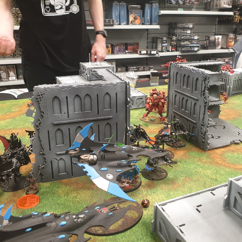 hard on one side, so I deployed well away from his Talos, and spent the whole game giving them a healthy respect which stopped them ever reaching combat. He was very unlucky on turn 1, not managing a unit kill on my Ravagers, while I blew up 2 of his in response.In theory the game went all my way from here on out, barring some lucky FNPs which kept key things alive a little longer than I would have hoped for. I nuked the Talos as they bimbled around mid-board not getting anywhere, I took out all his Ravagers, he never really touched a Crimson Hunter. I was doing all the Drukhari moves, kiting around things and not letting them get close.