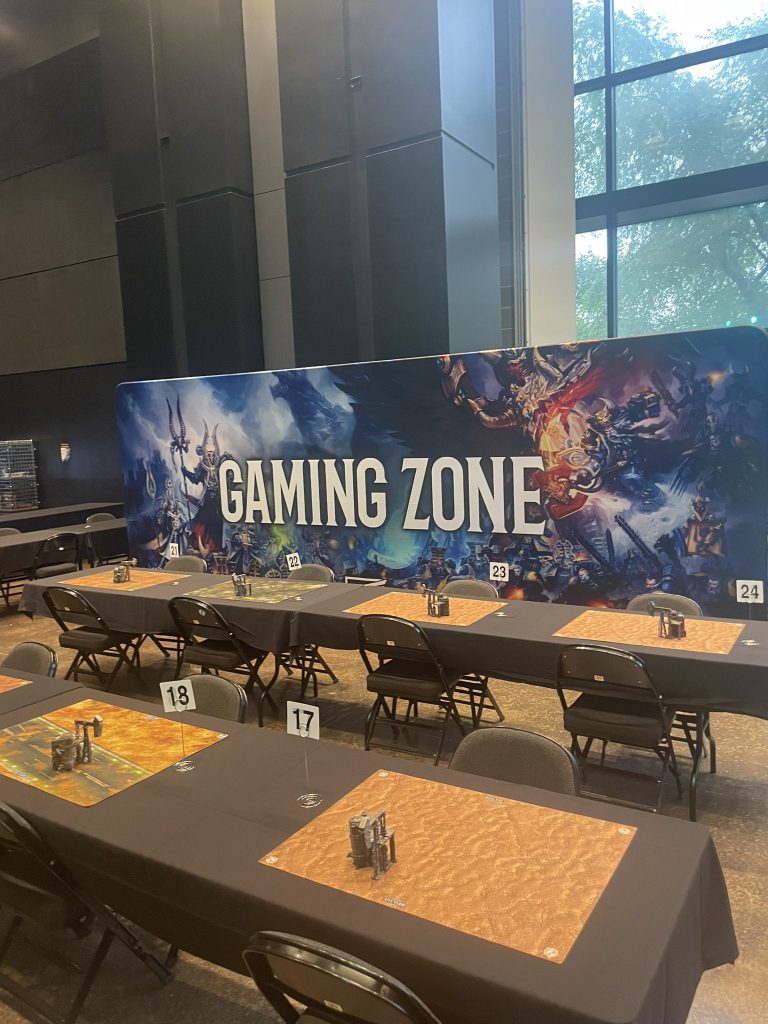 This area here, dubbed "THE GAMING ZONE", would be around where all the spearhead gaming would later happenAfter briefly standing, and then sitting, in line, myself and the other folks who signed up were whisked away behind some dividers and given two briefs by the Games Workshop design team. First, we weren’t allowed to take pictures, period. We could either voluntarily put our phones in a box, or keep them on us. But if anyone was seen with a phone, for any reason, that person would be kicked out. The team took this very seriously. It’s very cool to be able to try out an edition early, and leaks are a surefire way to make sure that never happens again.