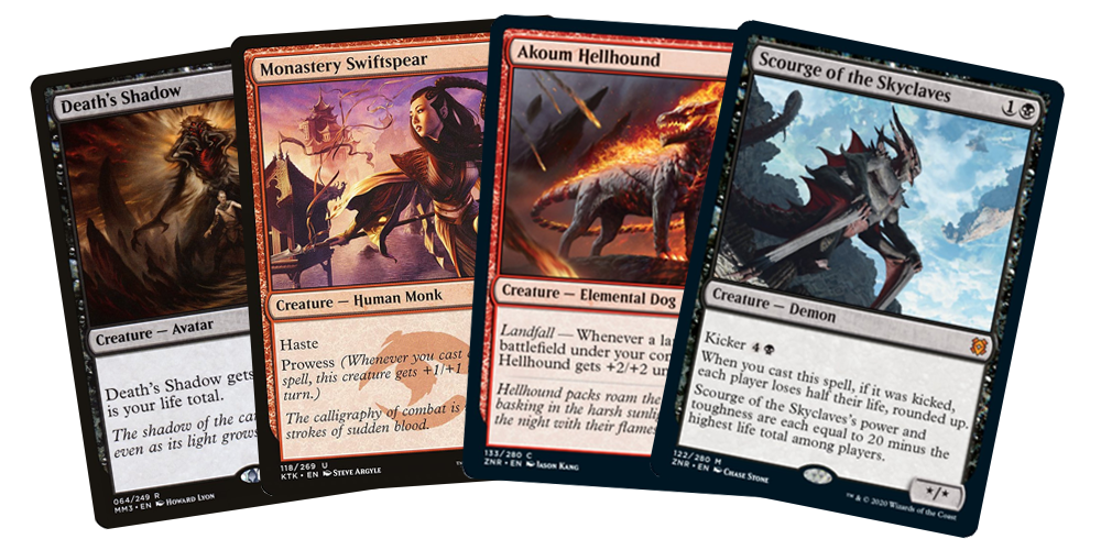 Credit: Wizards of the CoastIn Sunday’s Challenge, the 5th place list was more-or-less what my co-host Dave predicted would surface: Aggro Jund Shadow piloted by Maximusdee. Death’s Shadow, and Monastery Swiftspear are combined with the new Akoum Hellhound and Scourge of the Skyclaves to form our hyper aggressive creature package. A lot of other expected aggro Shadow cards like Thoughtseize, Street Wraith, Bolt, Become Immense, Temur Battle Rage, Mutagenic Growth, Mishra’s Bauble are all here. And, of course this deck can also run Lurrus - so it does.