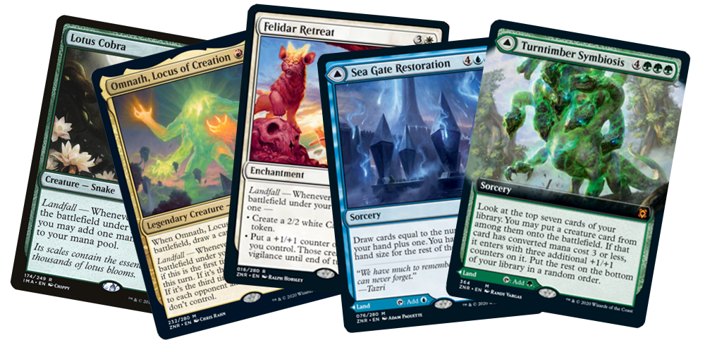 Credit: Wizards of the CoastHeading back to Saturday’s Challenge, the most interesting deck was perhaps 5th place KillerSUV’s wild one: 4-Color Uro Landfall Ultimatum. In what could likely be a Standard deck, this is featuring five new Pioneer cards in Lotus Cobra, Omnath, Locus of Creation, Felidar Retreat, Sea Gate Restoration, and Turntimber Symbiosis. This deck looks like it wants to quickly ramp to start playing potent threats like Agent of Treachery, Uro, Omnath, and, of course, Genesis Ultimatum, which lets you put any number of permanents from the top 5 cards of your library into play for the low low cost of GGUUURR.