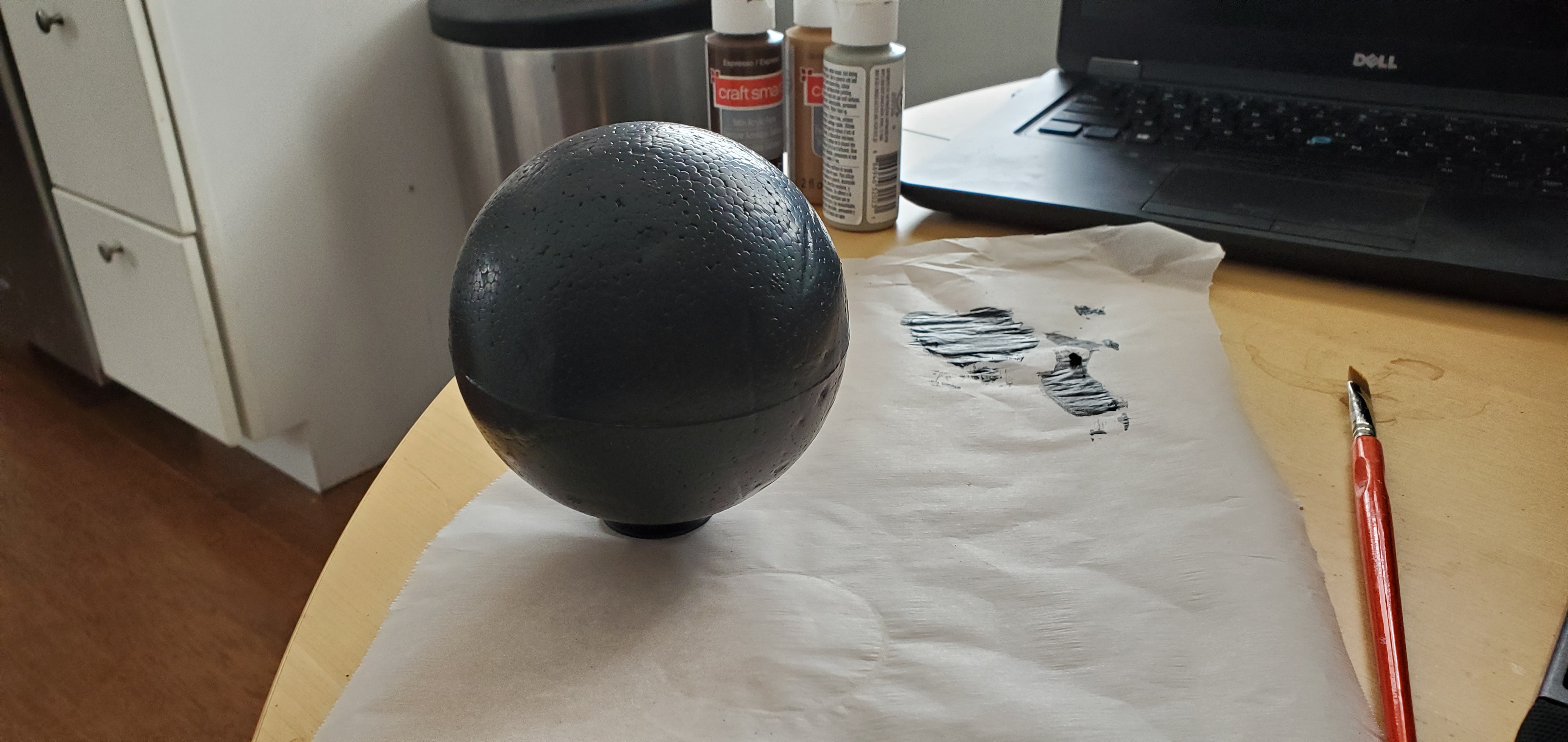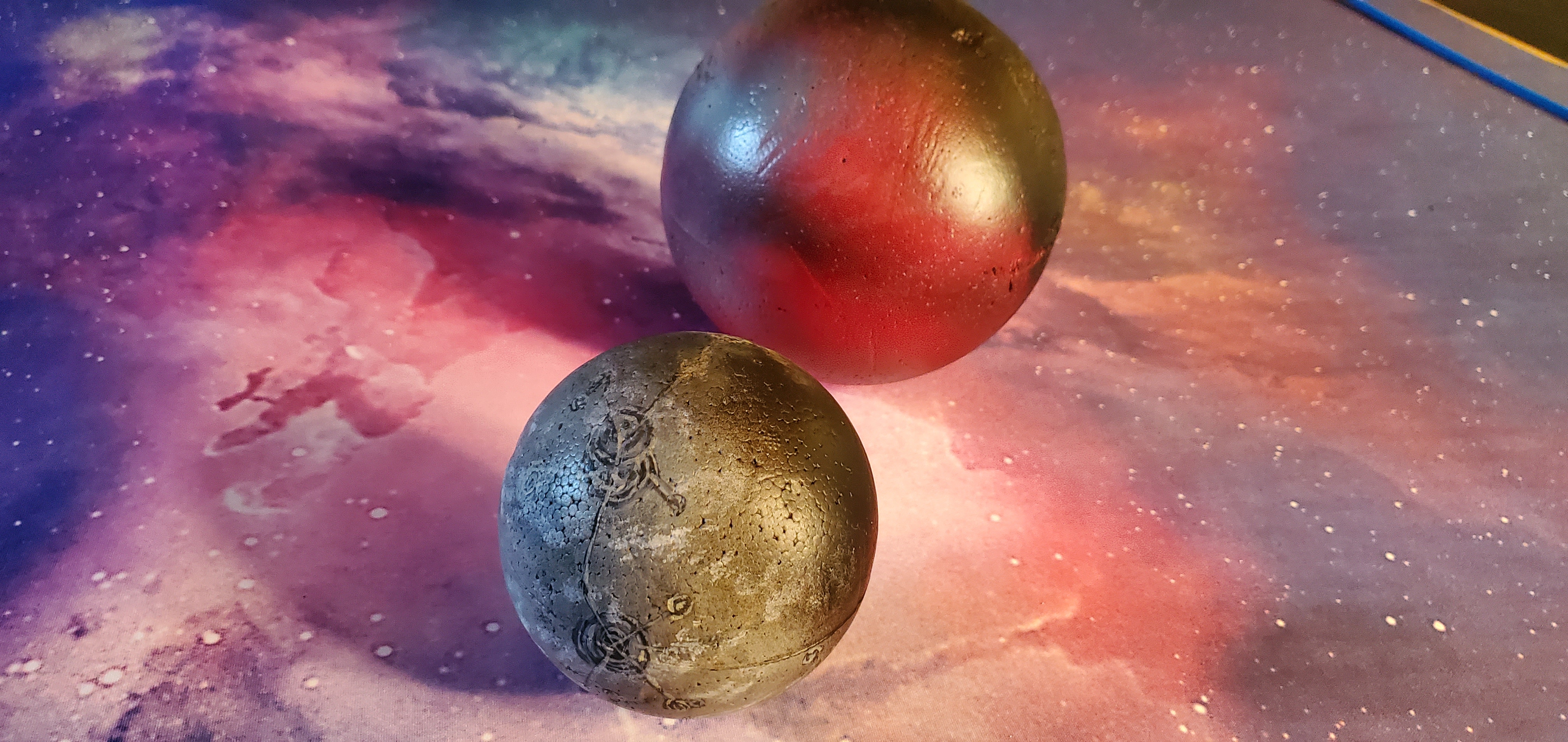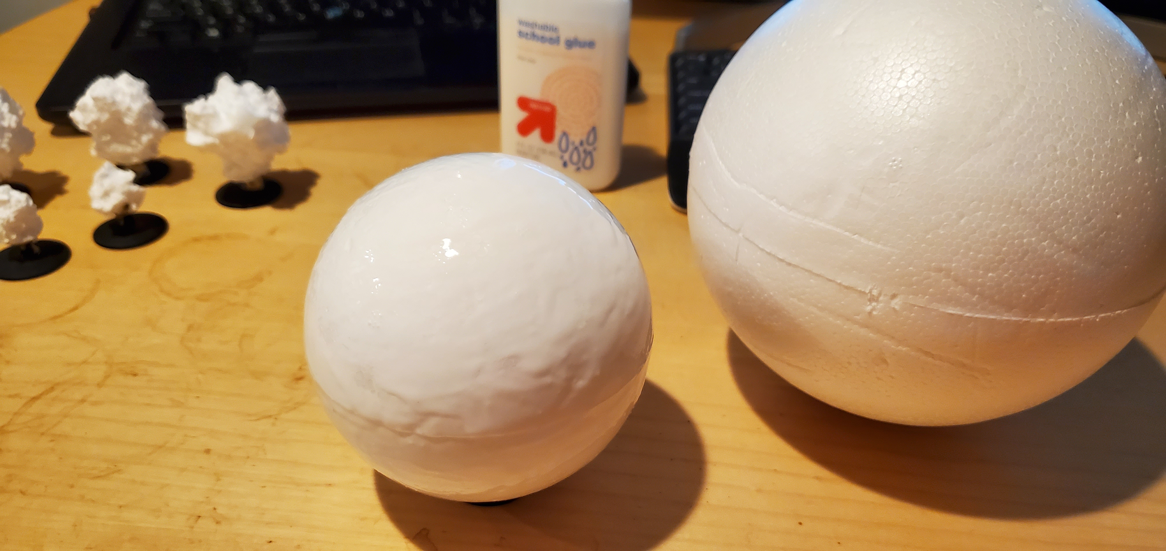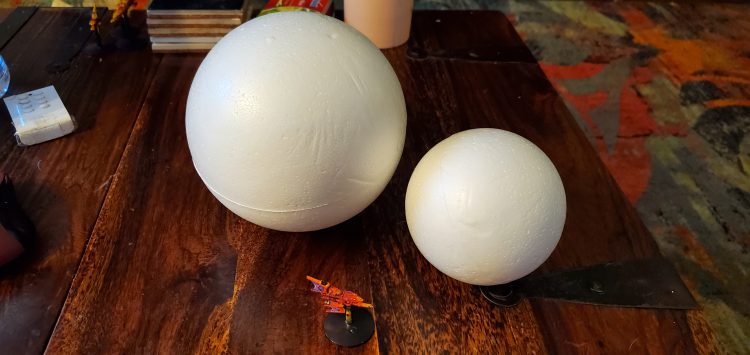 Small and Medium sized planets - I opted for full sphere's because I like the aesthetic of them over the halfUnlike with the asteroids, you don't necessarily want the pitting that comes with spray painting - so if you don't want that texture, applying a layer of PVA glue beforehand can reduce that risk. Unlike my example however, sanding the equatorial line is advised - it will show through.