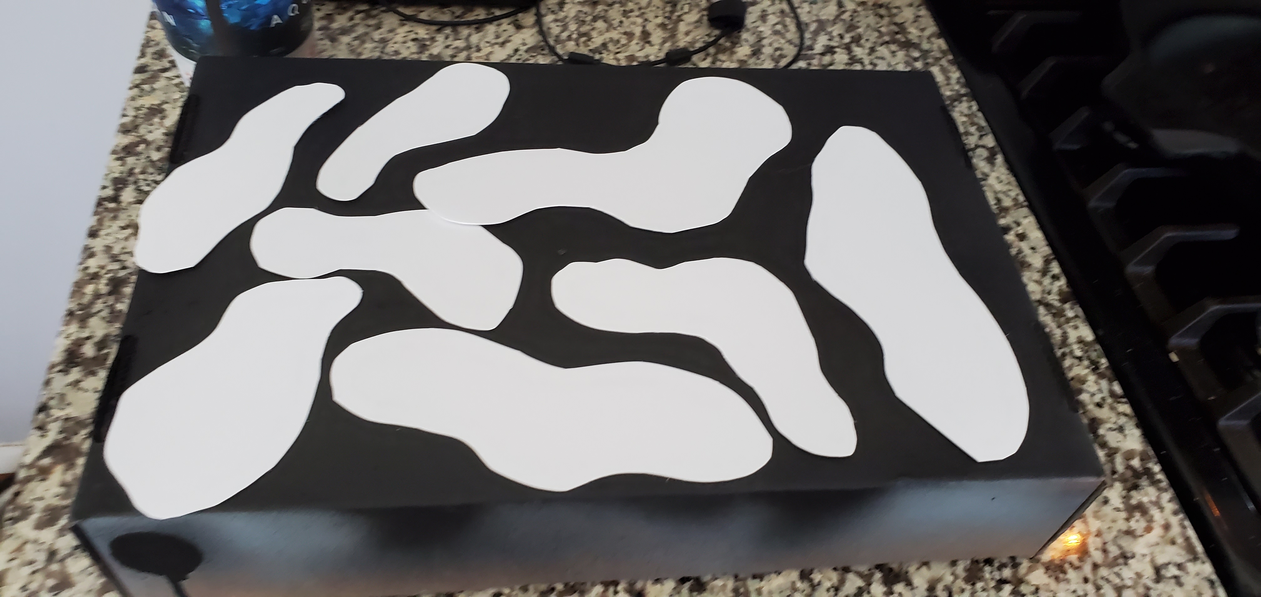 What do you see in the clouds?Typical black undercoat, but from there feel as creative as you want to be. Any colors you want. Purples, reds, blues, greens, oh my! I use spray paint but use whatever you want, airbrush, brush, whatever. Put some color down in a mixed gaseous way. Then grab your thick brush, dip it in white, and flick the bristles to put some stars on these bad boys. Once then, a real thin, lightly covering parts of the template final layer of spray paint and voila! A starry backdrop nebula/gas cloud/warp rift.