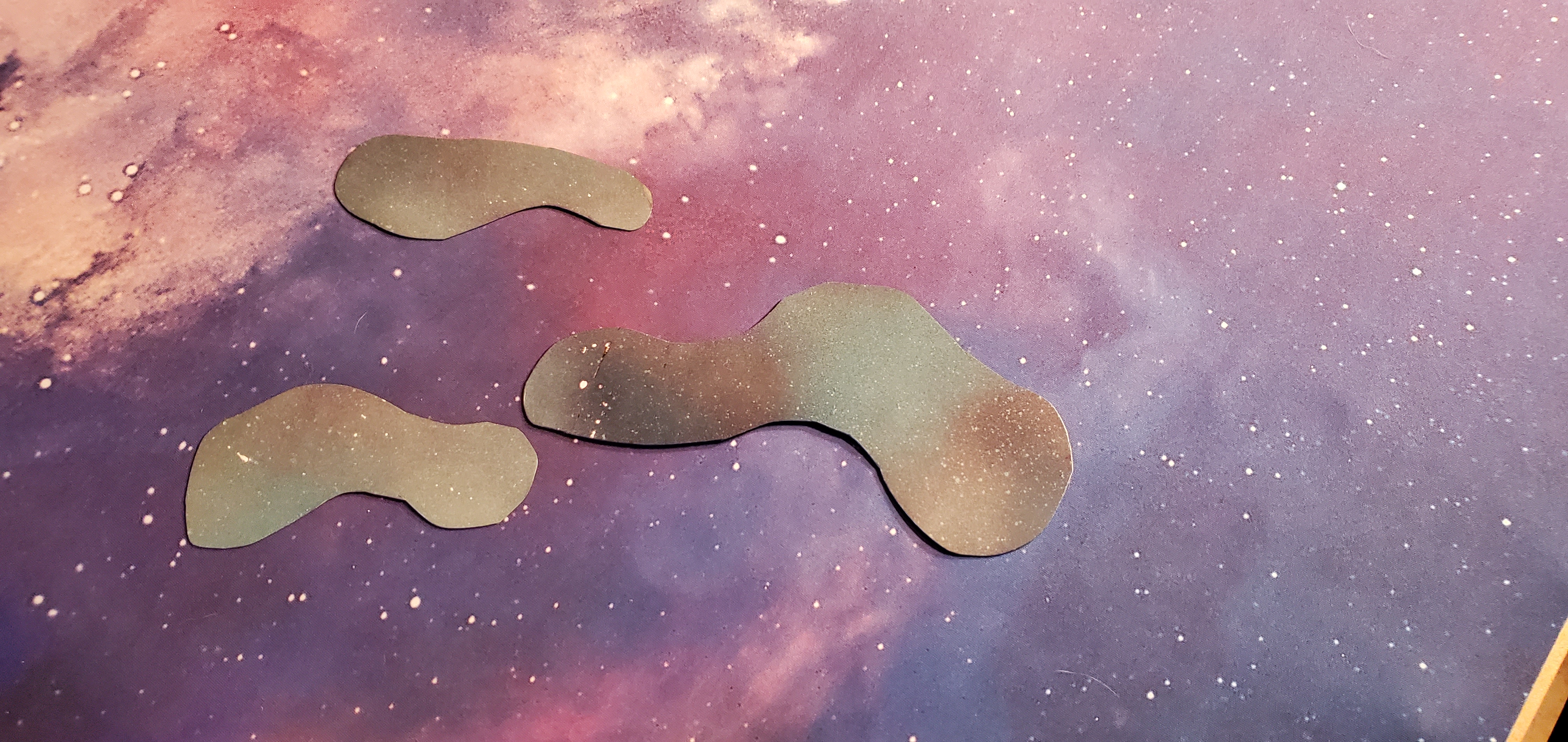 You can honestly use almost anything for this - but one of the things that you'll want is a 'functional' board. The absolute best looking gas clouds and warp rifts are large cotton clumps that have been stretched and painted to resemble colorful clouds of space dust or ferocious whirling maws of an open portal to the warp. Unfortunately, for as fantastic as these look, they can also be a little hard to place ships on and move through. So for that reason I opted for the next best thing - cut up and painted plastic card. I'm only going to show the gas clouds - but the warp rifts process is basically the same but the shapes are a little different.