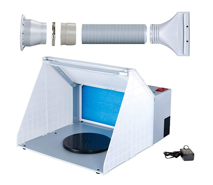 A spray booth is not strictly necessary if you’re airbrushing acrylics but it’s very highly recommended for the extra safety as well as a place for any overspray to go. A popular pick is the Master Airbrush spray booth which folds up to save space when you’re done, includes LEDs for lighting, and has an output hose for venting out of a window which is very useful for winter.