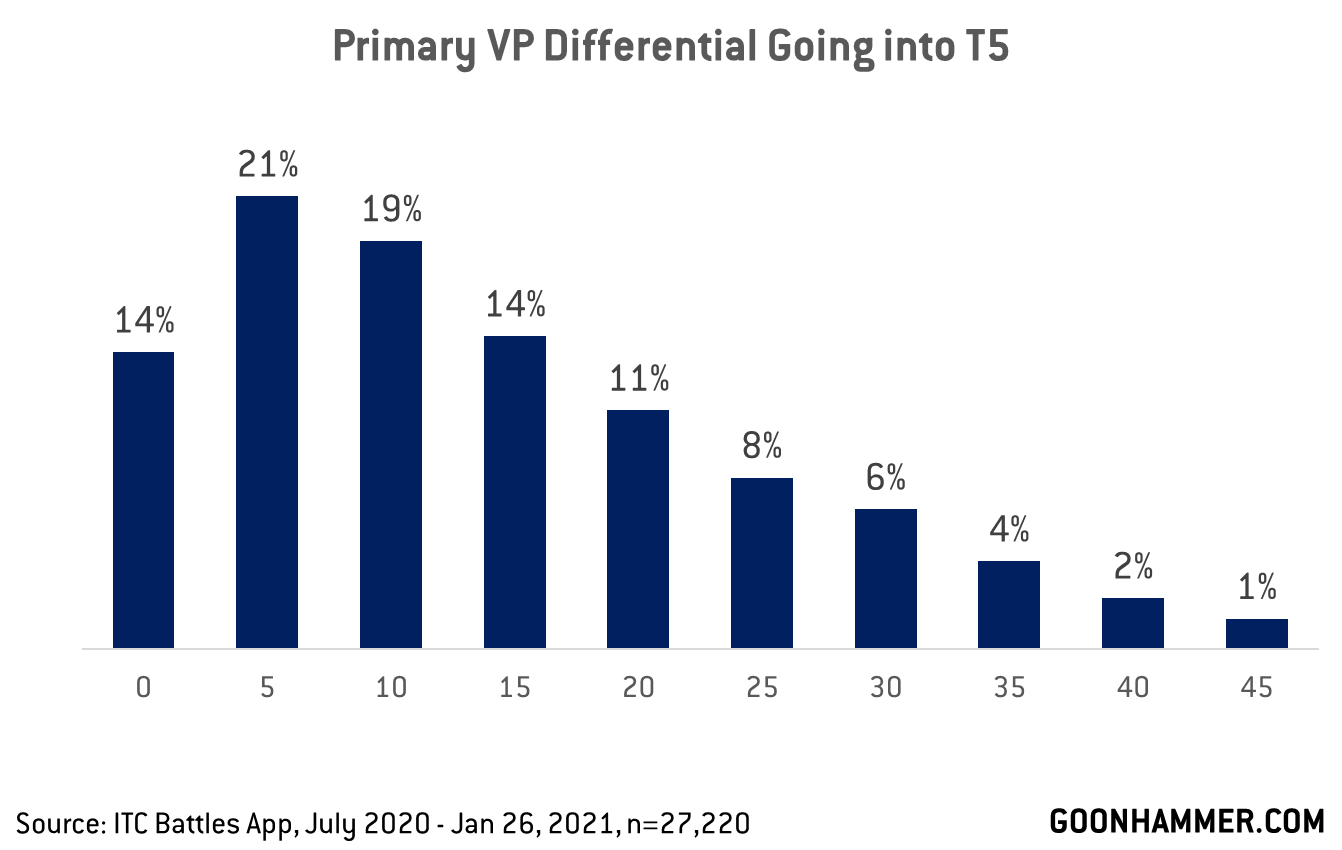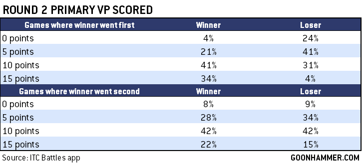 Statistically speaking, about 86% of the games in our sample went into the fifth battle round with one player having a higher primary score than the other. One good thing to know is that most games are pretty close with regard to primary VP scoring. More than half of games - 58% - see players coming into the fifth battle round with a primary VP score that has a closeable gap (15 points or fewer).