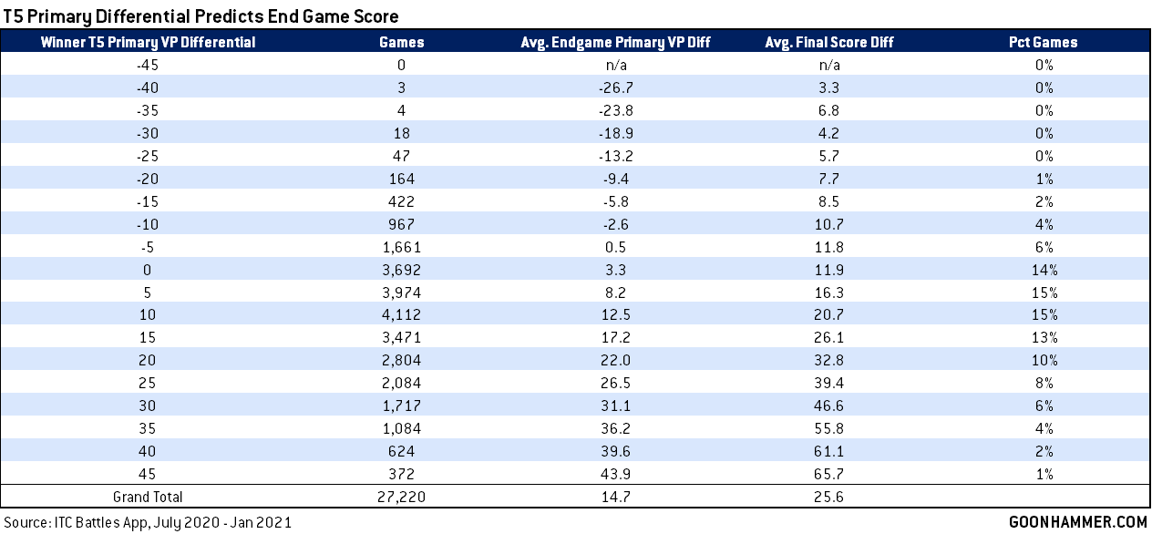 - Pretty much any game with a 25-point or more primary VP differential going into battle round 5 is a lost cause. Players turn those around less than one percent of the time and a player going into round 5 up 25+ point will typically win by an average of 39.4 victory points, really close to our blowout threshold.