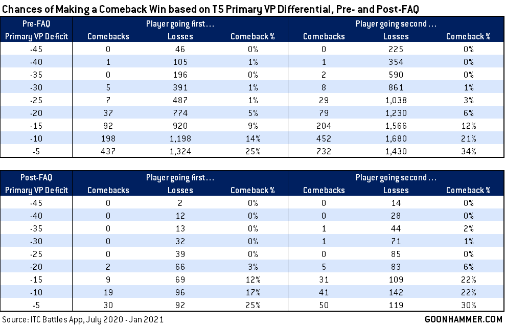So on the whole it looks like the FAQ has had a slight effect on game outcomes - about 2-3 percent of games so far, but that could be as high has 9-10% if more data shows the result for games with a 5- and 10-point differential going into the fifth battle round. With only 2-3% of games influenced however that means that the FAQ change also hasn't necessarily made a significant impact on the turn 1 advantage, if only because the opportunity for the scoring change to matter doesn't come up often enough. This is worth continuing to monitor for additional shifts and is something you can count on us covering again one month from now.