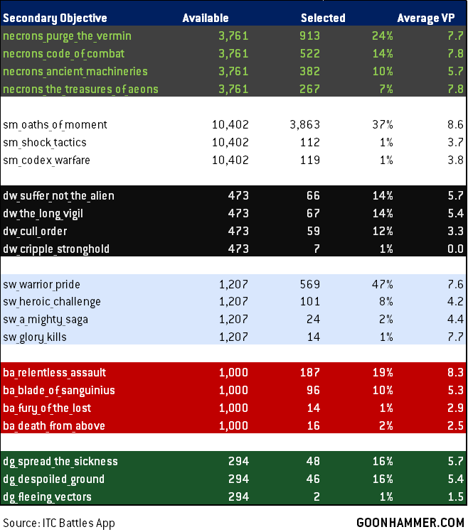 On top of this we have the faction-specific secondaries. Here we can see that there are some real standouts - almost all of the Necron faction secondaries are amazing, while Space Marines' Oaths of Moment is the clear stand-out for their faction and Warrior Pride looks like a very solid choice for Space Wolves while Relentless Assault appears to be emerging as the build-around pick for Blood Angels, though data on Blood Angels secondaries is very sparse. The interesting thing about this is that it suggests that non-Codex factions are at a real disadvantage if Necrons are consistently taking a secondary from their codex - something that happens in more than half of Necrons' games - and consistently scoring higher on that objective than they would with one out of the GT Missions Pack.
