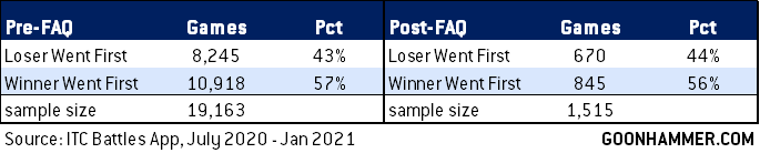 Let's go through these. We've already addressed the first - very few players regularly chose to go second before the FAQ. However identifying the impacts of this rules change on close games or games where the shift in scoring may make a difference is a bit trickier.