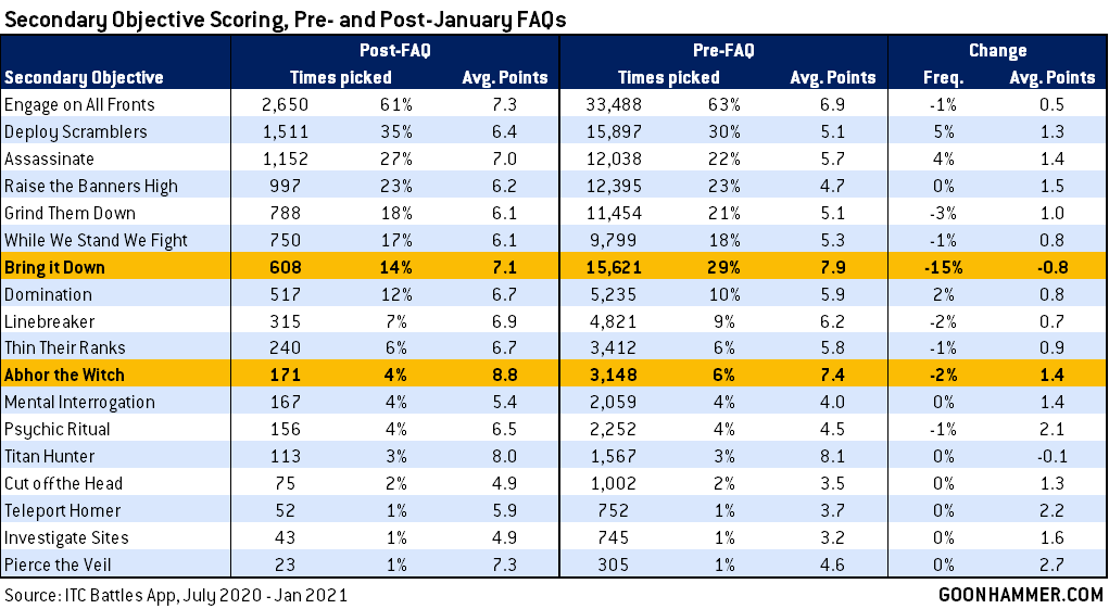 Looking at scoring shifts for secondary objectives since the FAQ dropped shows two major shifts: Bring it Down is now taken 15% less often (a statistically significant drop) and players taking it score an average of 0.8 fewer points than they did before, and Abhor the Witch is now being taken half as often - only 4% of the time - but tends to be worth 1.4 points more on average. Note however that unlike the drop in Bring it Down, these results are not statistically significant at the 95% confidence interval and may continue to shift over the next month. Still, this is an interesting result to consider - the number of games in which you'd take Abhor is now significantly less (and likewise you may be more likely to take a psyker in your list), but when you're up against lists where it's still easy to max, you're more likely to be making the right call.