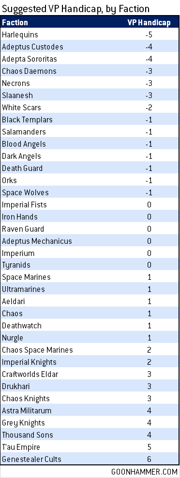 Using the rating difference from each game to predict the primary victory point difference, we can create the following handicaps by faction, in bonus VP allocated to the underdog: