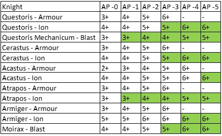 Legions Imperialis Knight Ion Saves - Green is where the Ion save is better, and note how little green there is.As you can see the Ionic Flare Shield makes a difference when facing Blast or Barrage weapons (and this is present on the Moirax and Mechanicum Questoris Knights but not the Knight Atrapos) and Ion Shields are only marginally useful on most knight types, and almost completely useless on the Acastus. The only knight where Ion Shields are really useful are Cerastus Knight Atrapos and Knight Lancer, and this is because they have a 3+ Ion save, meaning when facing anything with -1 AP or higher Ion shields provide the better save.