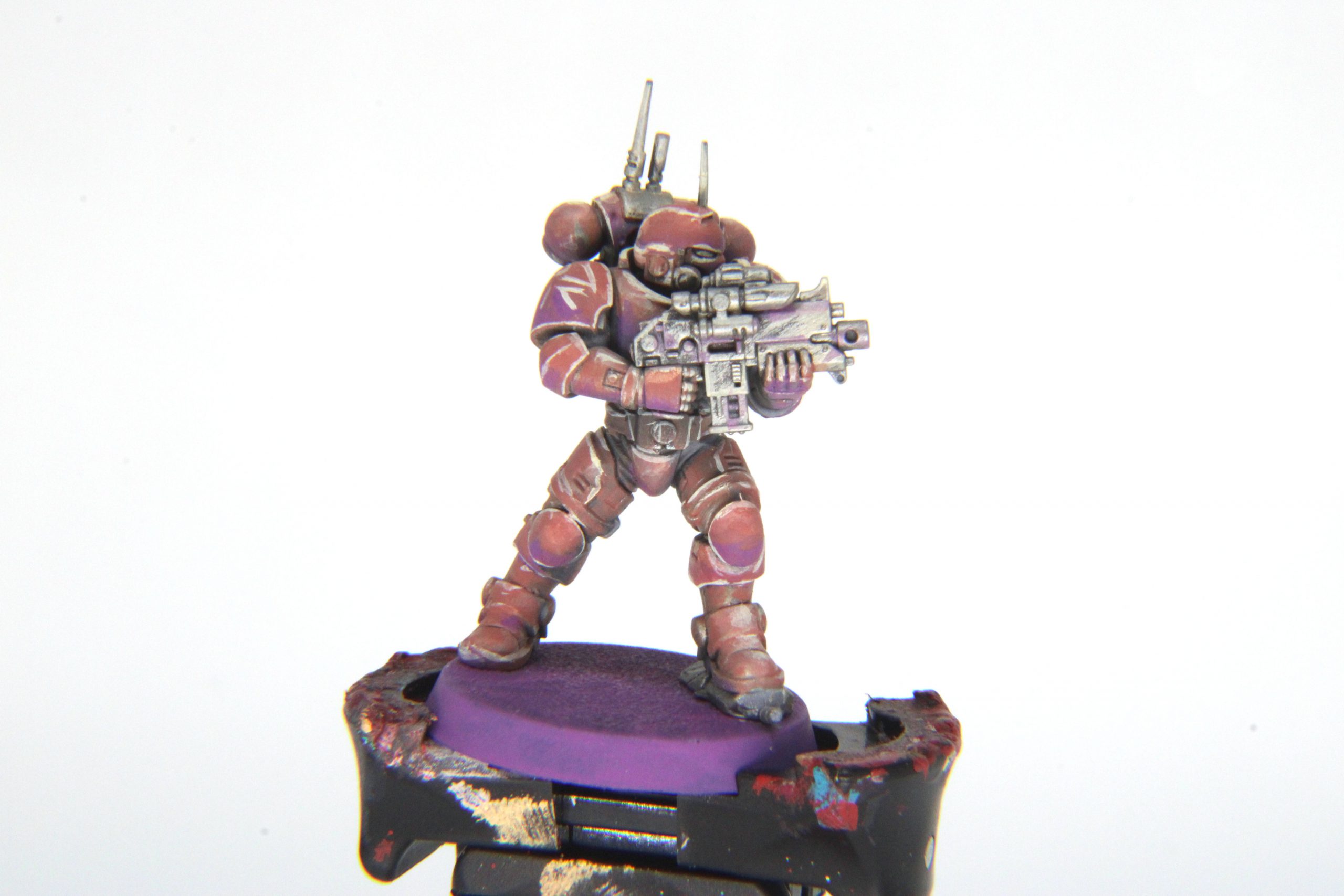 When Bend, Oregon's Modern Games, my FLGS, started carrying Monument Hobbies Pro Acryl paints in October, a few of us in the community wanted to do something special. Quite a few of us had already been Crylpilled, so were excited to get these paints into peoples' hands. After cooking on it for a second, we devised a challenge:My buddy (and community fixture) Michael Kriegler reached out to Monument Hobbies and within a single email got them on board, with Modern following suit. A few days later and our event was in the books for December. In preparation, the community donated some random Space Marines - Intercessors, Infernus Marines, Hellblasters, you name it - and got them built and zenithal'd. Zac, Erika, and myself would be judging, and along with Michael we devised a randomized system for determining paints. I was content to truly let fate decide, rolling a pair of dice corresponding to the rows and columns of the Monument paint rack at the store. Zac instead devised a system with a little less variation and a little more control, so every attendee would be getting a saturated hue, a dark/mixed hue, a light hue, and a metallic, with a single reroll if desired. This would avoid someone getting four variations on beige or whatever, and somewhat level this randomized playing field. We settled on a grading rubric and promptly threw it out in favor of a 1-10 scale. Even the best events are held together with at least some chewing gum and duct tape, afterall. With the word out on social media and some excitement drumming up in our local Discord, all we could do now was cross our collective fingers and wait til mid-December.One night. Four paints. One Space Marine.
