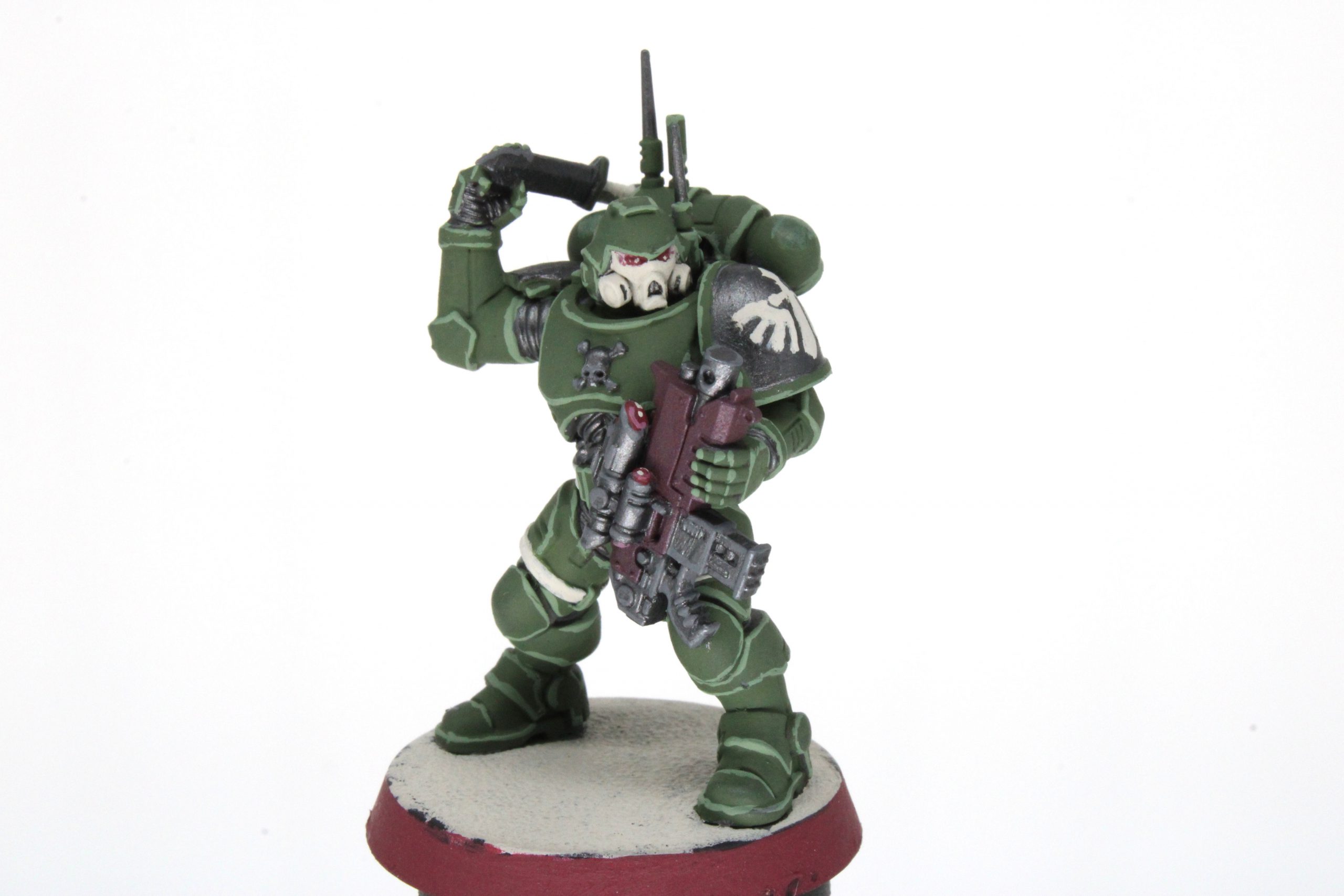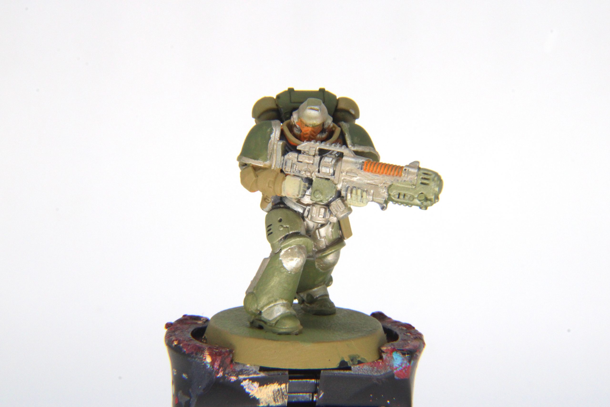 This was not only this Drew's first Space Marine, but his first time painting a miniature altogether. Not only did Drew use all four colors, but he tried blending for highlights and applied them fairly neatly. I was happy to give him feedback, and I'm thrilled he went for it. Welcoming new blood is the only way our communities can continue to grow, and encouraging those folks will keep them coming back.