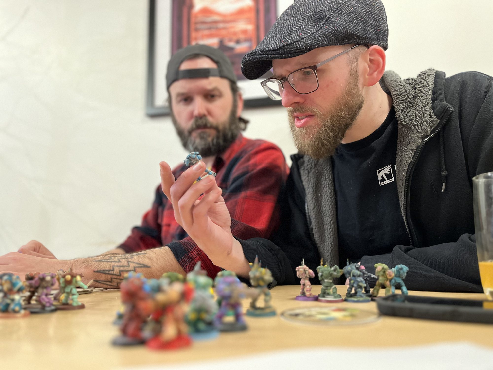 I'm the white guy with the hat and the beard. No, the other one. Credit: ErikaWe had hit 9pm, and Zac, Erika and I had some work to do. The painters largely filtered out of the store, going next door to River Pig for some beers while their work would be evaluated. We had awards to hand out for 1st, 2nd, 3rd, and Wooden/Golden Spoon, so we got critical. We figured most of the journeyman paintjobs for the 4-7 range, where people understood the assignment and just tried to get colors on there. Golden Spoon would involve finding one of the newcomer paintjobs and commending them for clearly putting in the effort. For 1st-3rd we were looking for clean lines, blends, highlights, and other more advanced techniques. Zac and I were generally in alignment on most models, usually coming within a point or two of each other on our grading spreadsheet. Erika was the self-appointed "mom vote"; a tiebreaker and someone looking for a certain X factor that Zac or I might have glossed over. We had roughly 30 Marines in 30 minutes to look over, so we blasted through and tried to judge as best we could with the time we had.