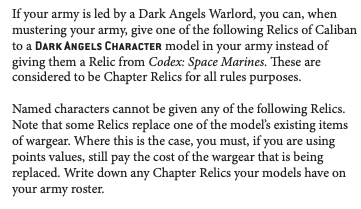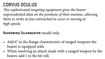 The Ravenwing Talonmaster is now able to take his Corvus Oculus! Before, vehicles - even if they were characters - were unable to take any relic. Now, our Talonmaster gets his fancy scope, and that's it. All other relics were left the same here, so special issue wargear is still unavailable to him. I want my Master-Crafted Twin Assault Cannon GW!