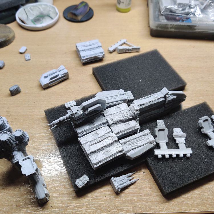 The Resistance Dreadnought kit still under construction, courtesy TTCombatYeah, it's honestly a spaceship Lego. Each piece is probably an inch big, and then you can add a bunch of them together to make your dreadnought however you want. There's three different sizes of dreadnought you can make from the kit. I'm not doing the maths on how many variations you can because it's basically infinite at this point. There's so many different things you can make and we've been having fun playing with them in the office, like making different builds.