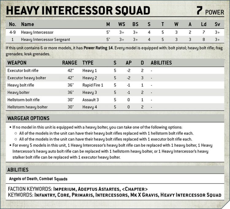 - Invictor loses Heavy Sidearm, which basically means it has to take the -1 to hit for Big Guns Never Tire. It does still have a regular heavy bolter and not the 1 shot thing that people were anticipating from the box datasheet, though, which is nice