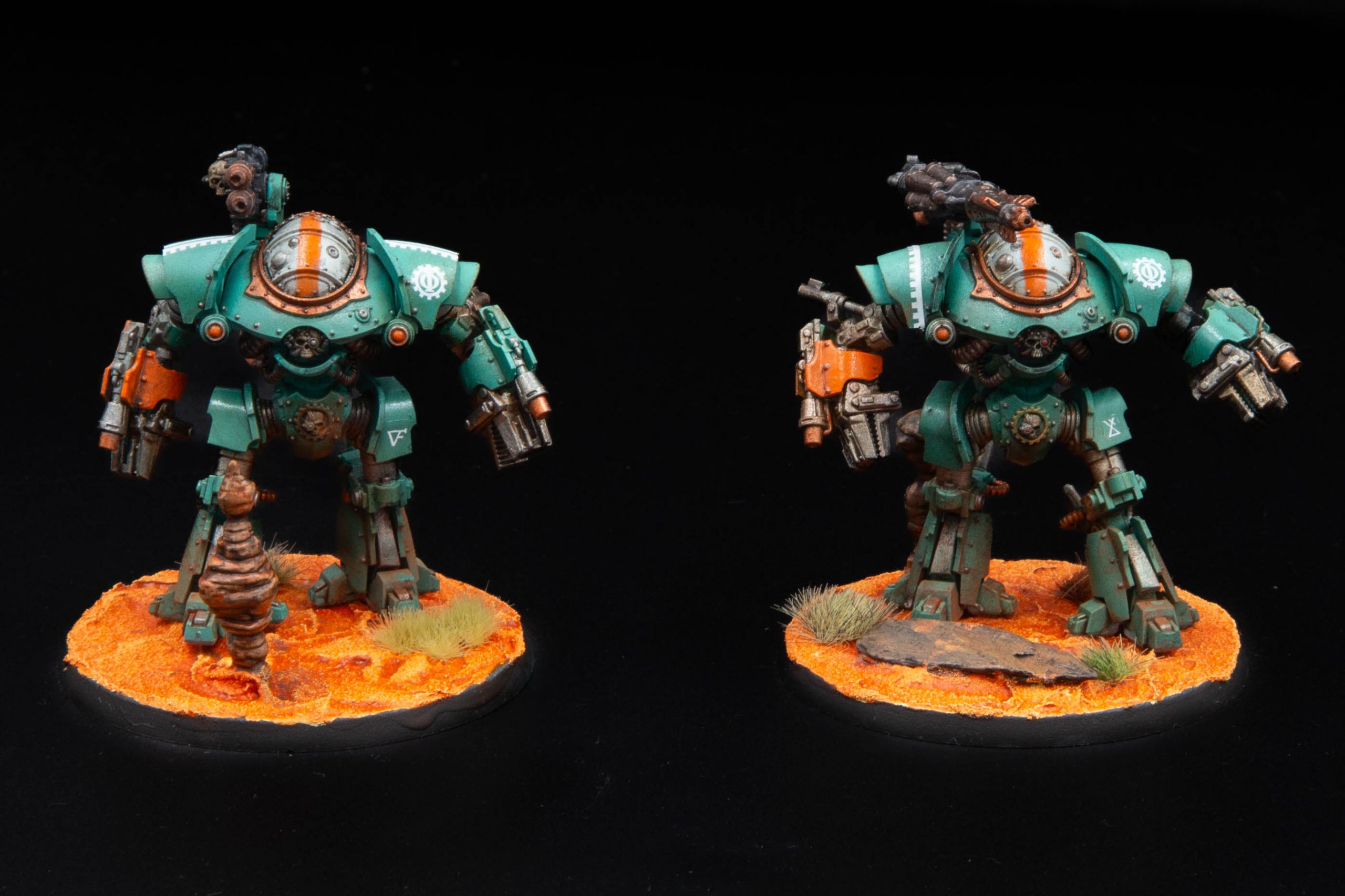 When trying to figure out a scheme, I wanted to do something which would complement the basing I use on my White Scars. While on holiday, I saw -aROs">Medders’ Miniatures video on speedpainting Mechannicum which sold me on a green based scheme. I was rather tempted to go for purple as an accent colour ( ala Devastator or EVA-01), however went for orange and hints of white to complement the bases more.I tend to be an army painter rather than an individual model painter, so went with a basic airbrush > airbrush zenithal > metals > oils approach. I skipped on things like edge highlights, which still managed to deliver a result that I'm happy enough with. For those curious as to the paints used, I've listed them below: